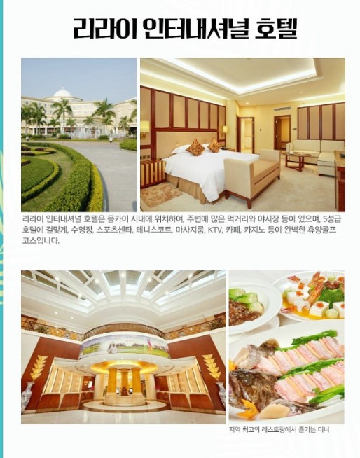 · 리라이 인터내셔널 호텔: 몽카이에서 유일한 5성급 특급호텔로, 골프장에서 차로 약 15~20분 가까운 거리에 위치합니다. 넓고 깨끗한 객실, 야외 수영장, 스파, 피트니스센터, 카지노 등 다양한 부대시설을 갖추고 있습니다. 또한 호텔 레스토랑에서는 신선한 해산물과 글로벌 메뉴를 즐길 수 있습니다 . 1층 로비 안쪽으로 편의점이 있어 편리하고 유흥주점까지 있어 라운드후 노래부르며 한잔하며 즐기기에도 엄지척인 특급 럭셔리 호텔입니다,