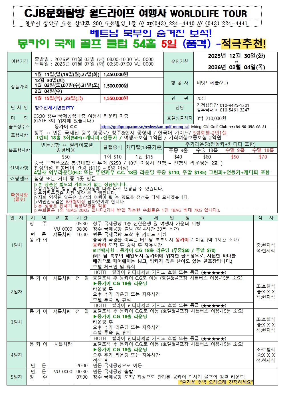청주공항에서 번동공항 직항. 베트남 국적기 비엣트레블 특별전세기로 출발합니다, 3박5일 패턴이며 출발일자는 12월30일, 2026년 1월3일, 7일. 11. 15, 19, 23. 27일, 31일, 2월4일 출발 단 10회만 진행하는 현지 골프 라운드 최적시즌에 진행하는 검증된 럭셔리 CJB문화탐방 몽카이 황제골프 일생일대 기회를 놓치지 마시기 바랍니다,,,