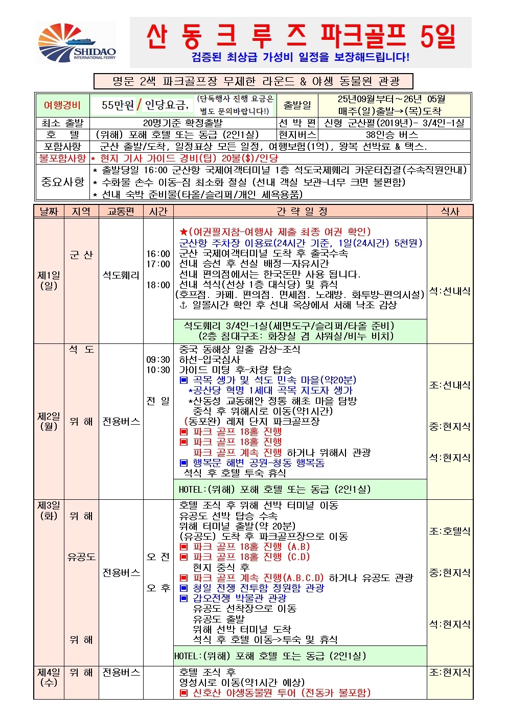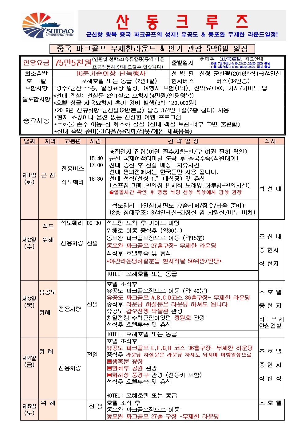 군산항 산동크루즈 중국위해 파크골프의 성지 동포완 27홀규모, 유공도 36홀규모, 2색골프장 무제한 라운딩+ 인기관광지 5박6일(화,목)출발, 4박5일(일)출발 최상인기 일정 전국예약센터 월드라이프여행사