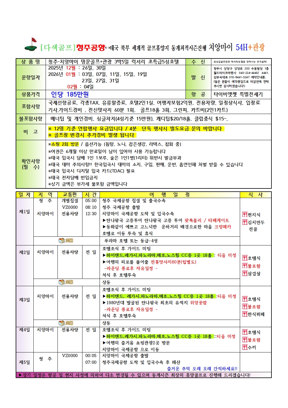 청주공항 태국북부 세계적휴양 관광지 치앙마이 골프 동계최적시즌1226-0204 기간 특별전세기 진