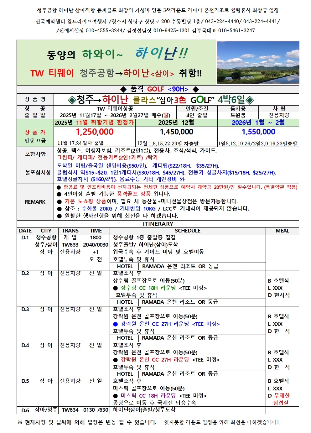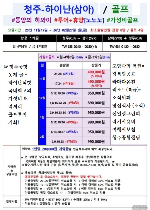 청주공항 동계골프의 천국 하이난 직항 1117-2월27일 기간 최강 가성비골프 특별전세기 기회 전국예약센터 월드라이프여행사