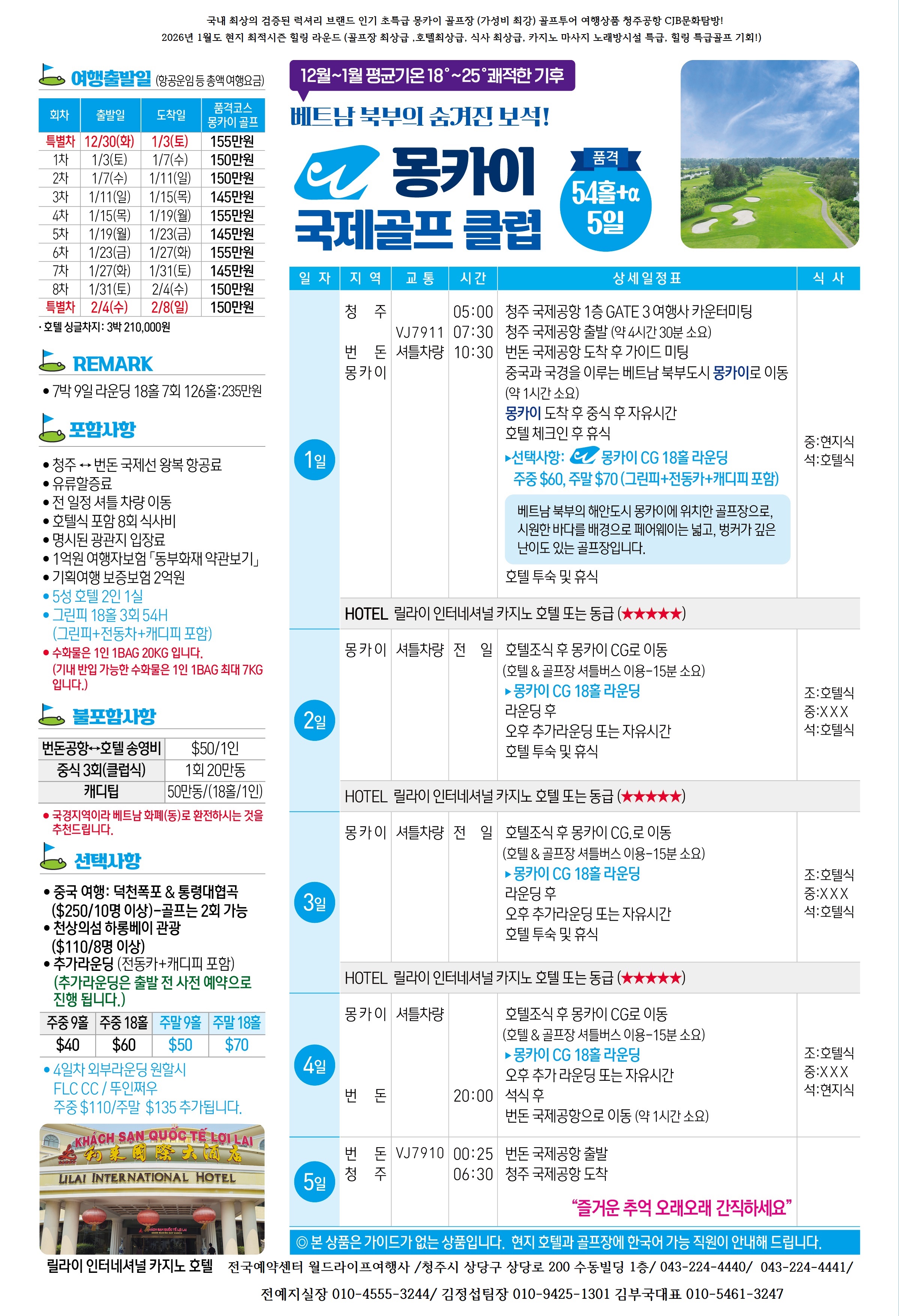 CJB문화탐방 청주공항 베트남 북부 초특급 명문 몽카이 국제골프 클럽 최상급 관리 가성비 최상 최적시즌 골프 2026년 1월도 직항특별기 진행기회 전국예약센터 월드라이프여행사