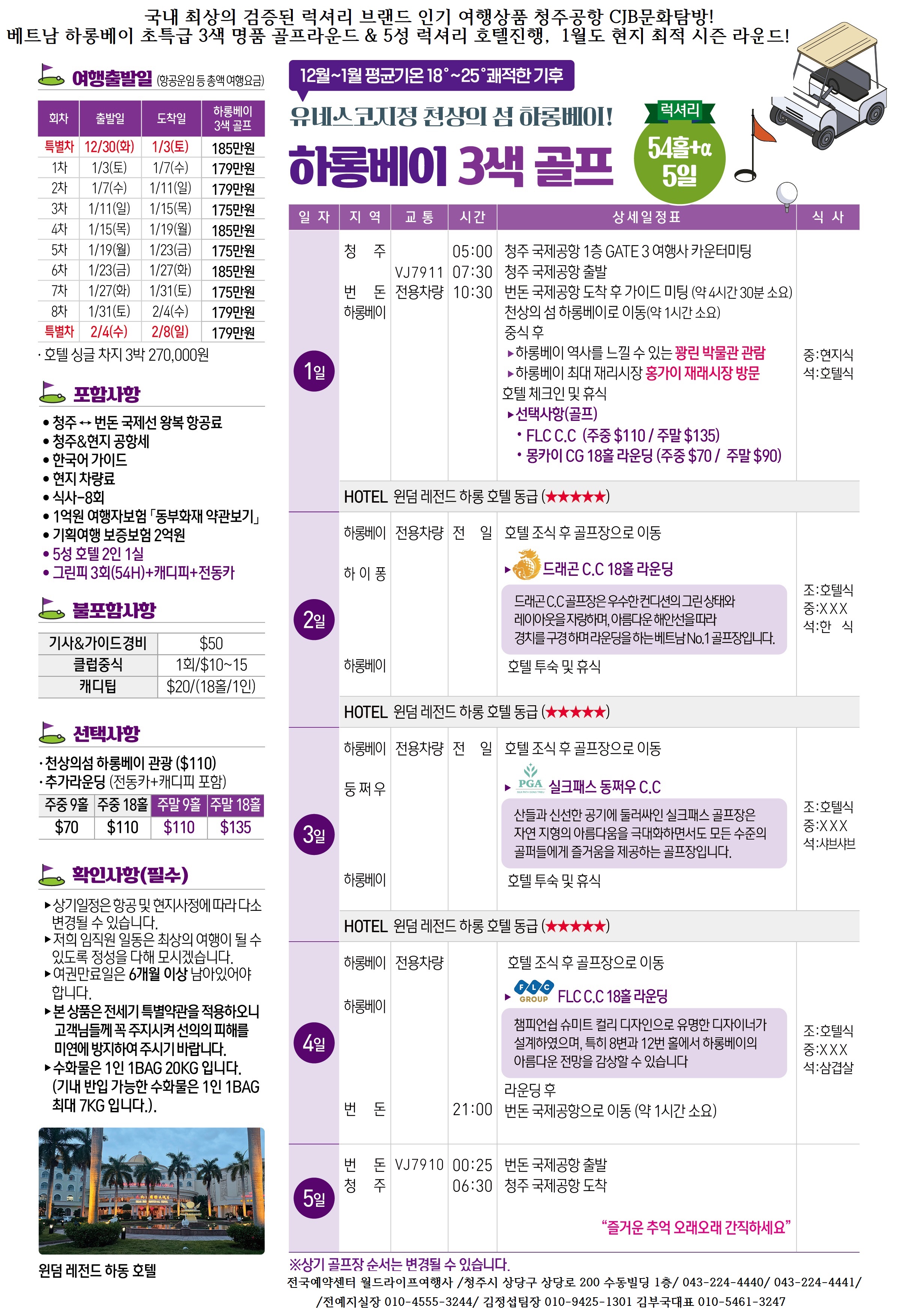 청주공항 CJB문화탐방 하롱베이 초특급 명품 3색골프 럭셔리 투어 2026년 1월도 특별전세기 진행 전국예약센터 월드라이프여행사 김부국대표 010 5461 3247