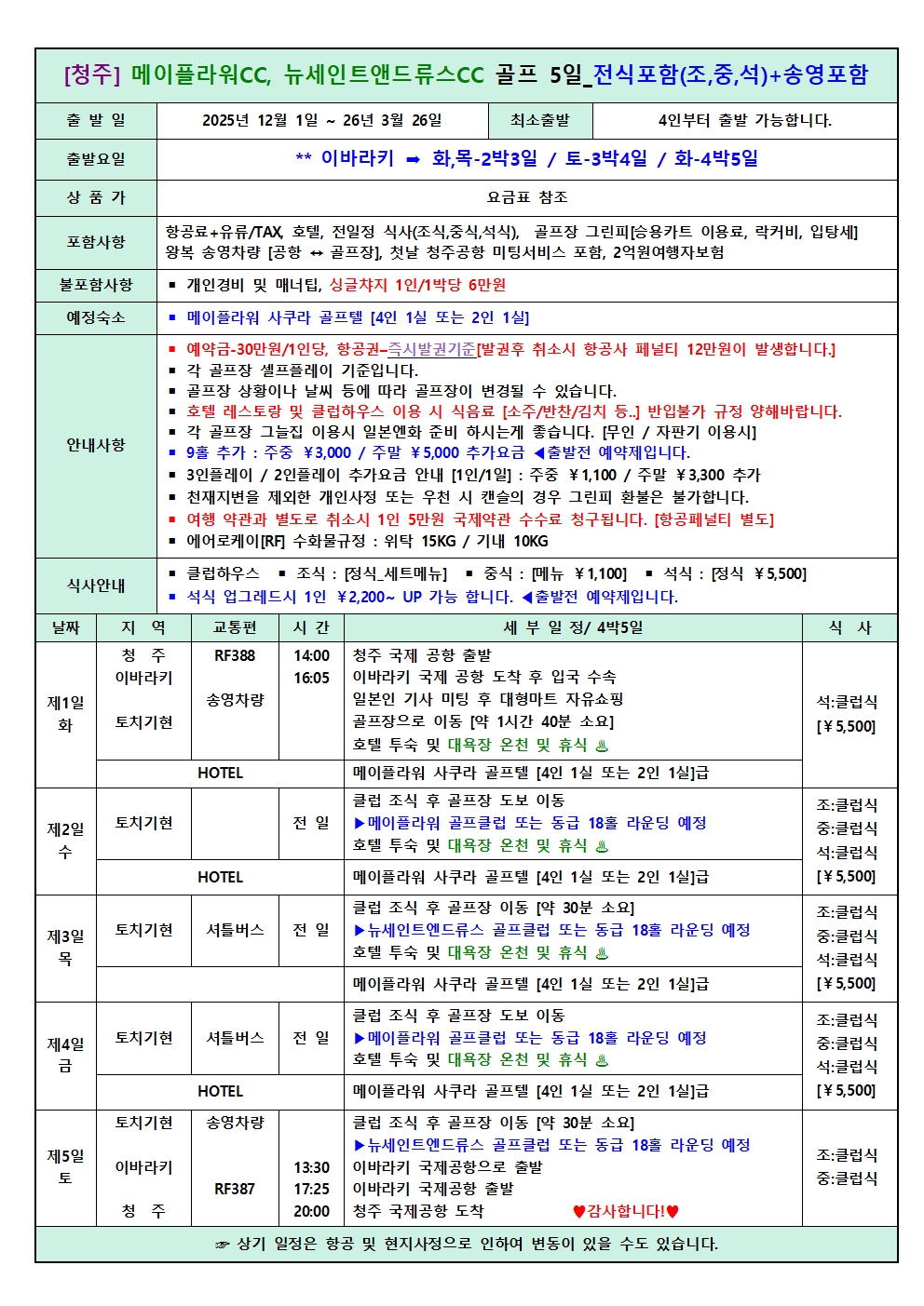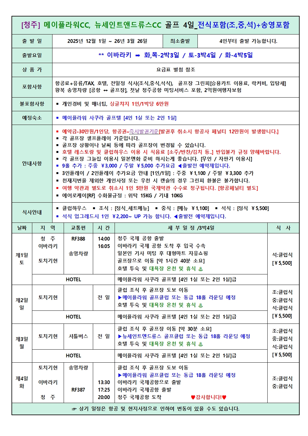 참고사항 1-2월도는 현지 폭설등으로 골프장이 잠정 클로즈됨을 양해바랍니다!