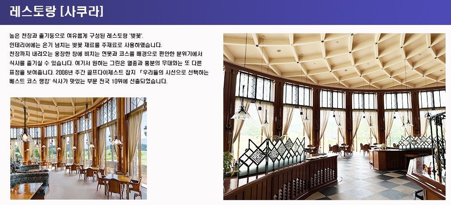장점: 라운드 후 이동이 바로옆이라 골프장 시설과 연계된 ‘골프+숙박’ 패키지를 편리하게 이용할 수 있음. 코스 뷰 객실과 자연 속 휴식 공간, 레스토랑의 지역 제철 신선한 식재료사용 식도락식사 요리도 큰장점.