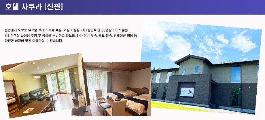 객실구성: 본관과 신관 (신관은 다이닝 키친·유닛배스 포함으로 장기 체류형 설비 보유) 등, 가족·단체 수용 가능한 넉넉한 객실 설계. 객실에서 코스 전경을 감상할 수 있는 객실이 있음.