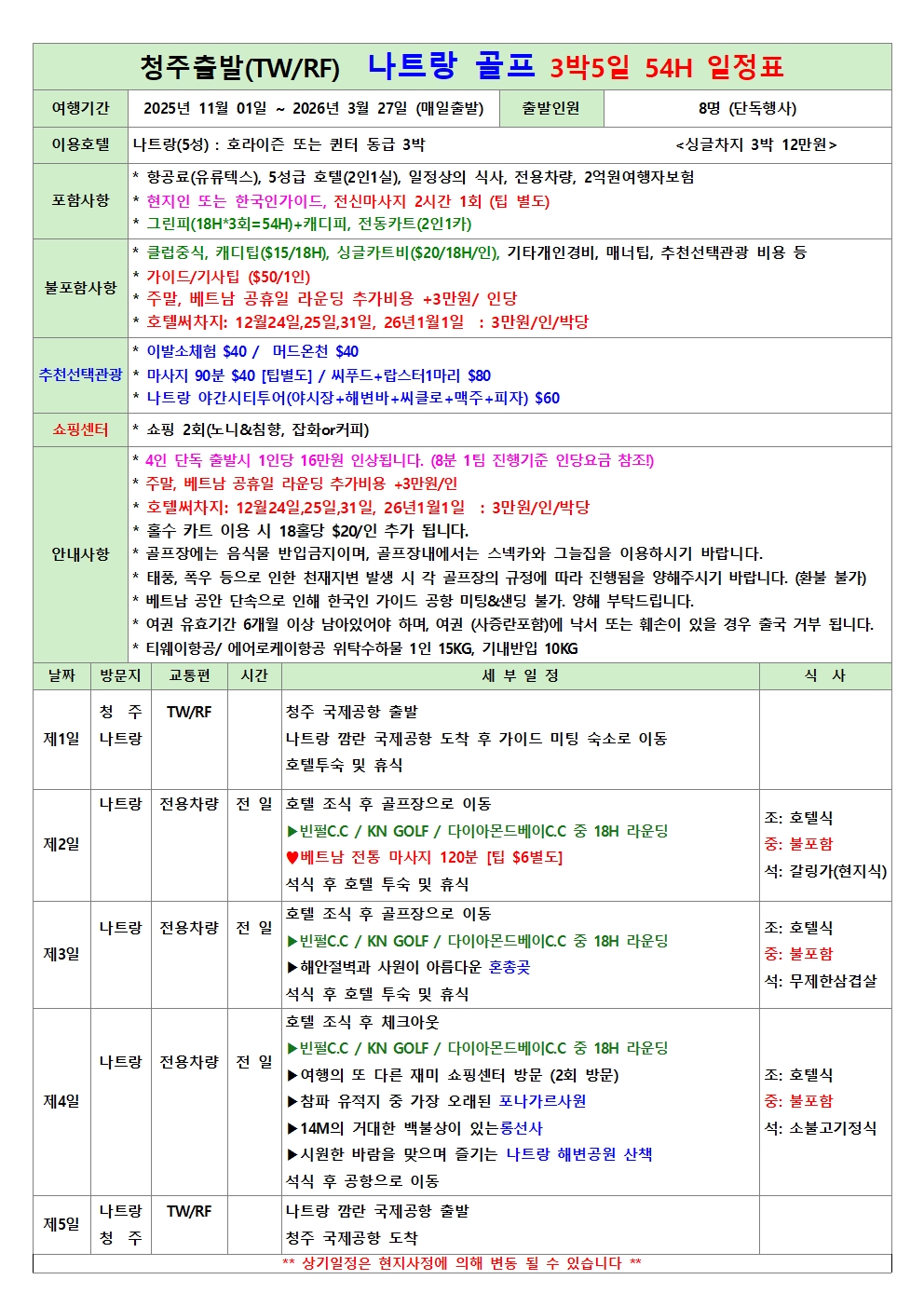 청주공항 동양의 나폴리 아름다운 나트랑 3색 초특급 럭셔리 최강 경쟁력 서비스 보장 ! 골프투어 11월-2026년 3월도 기간