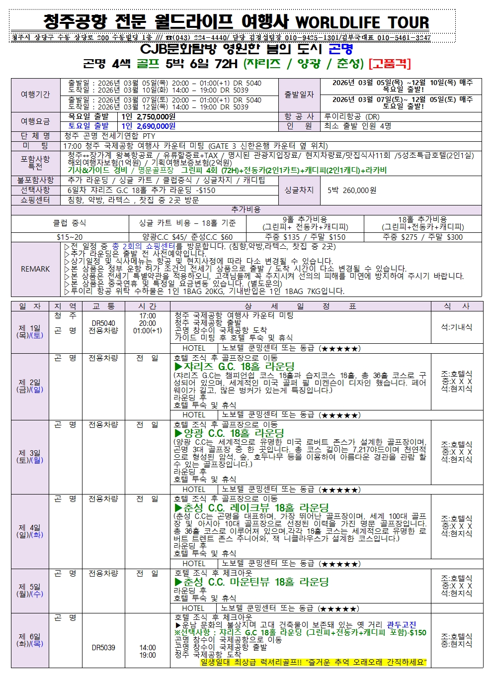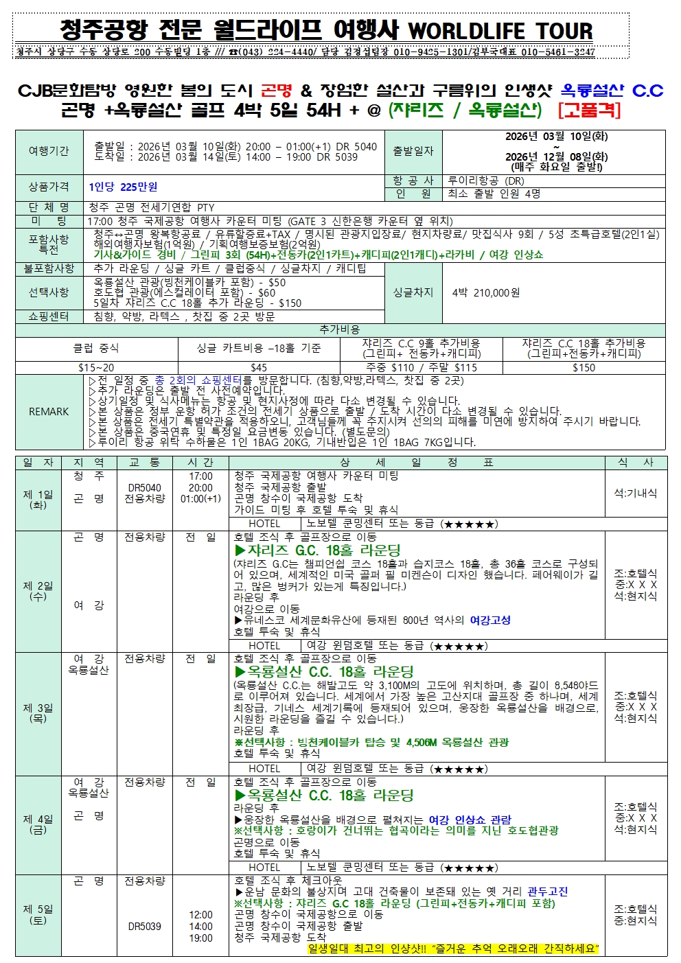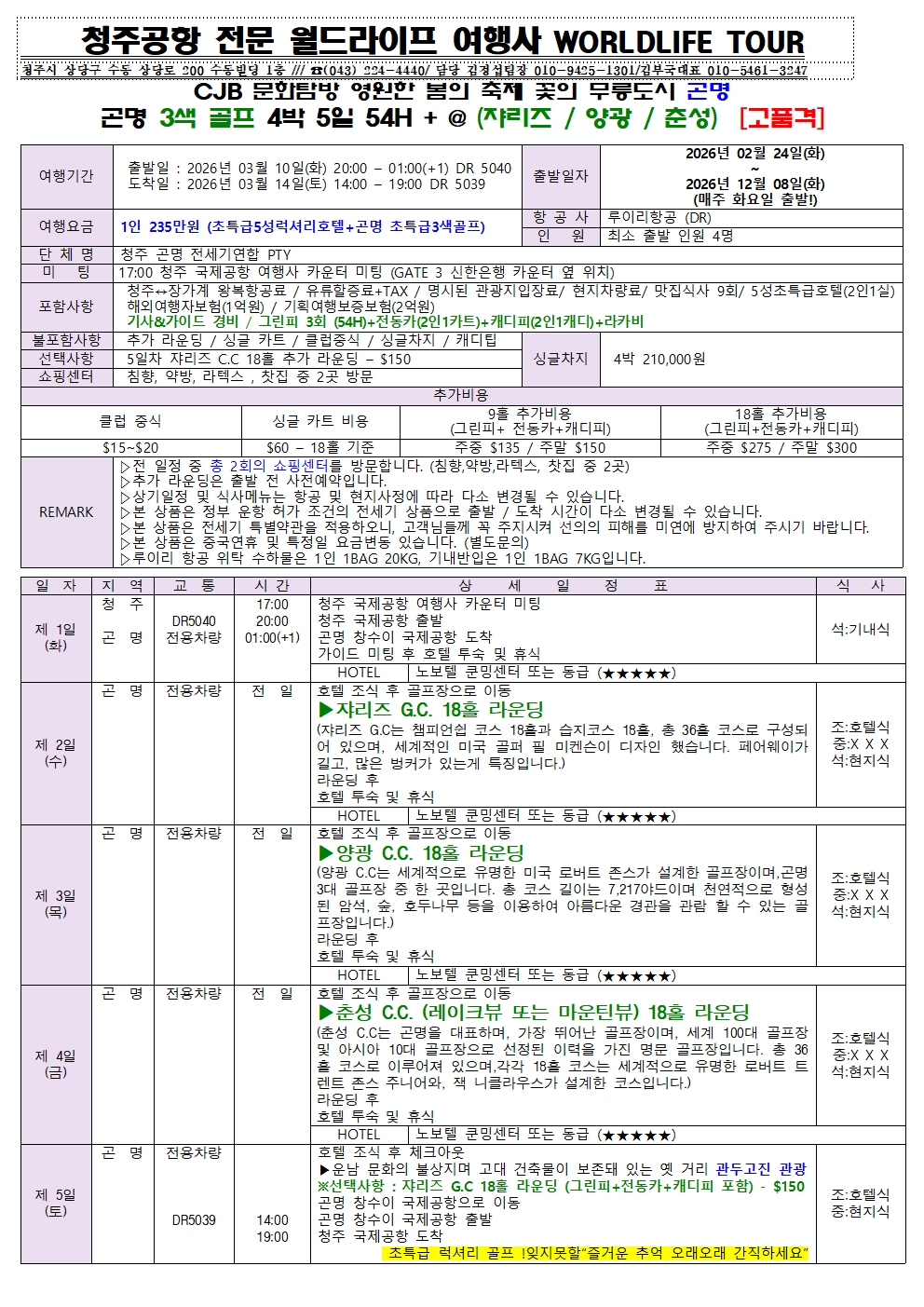 청주공항 2026년 3월-12월도 CJB문화탐방 4계절 꽃의 무릉도원 곤명 초특급 3-4색골프 & (쟈리즈+옥룡설산)CC 골프일정