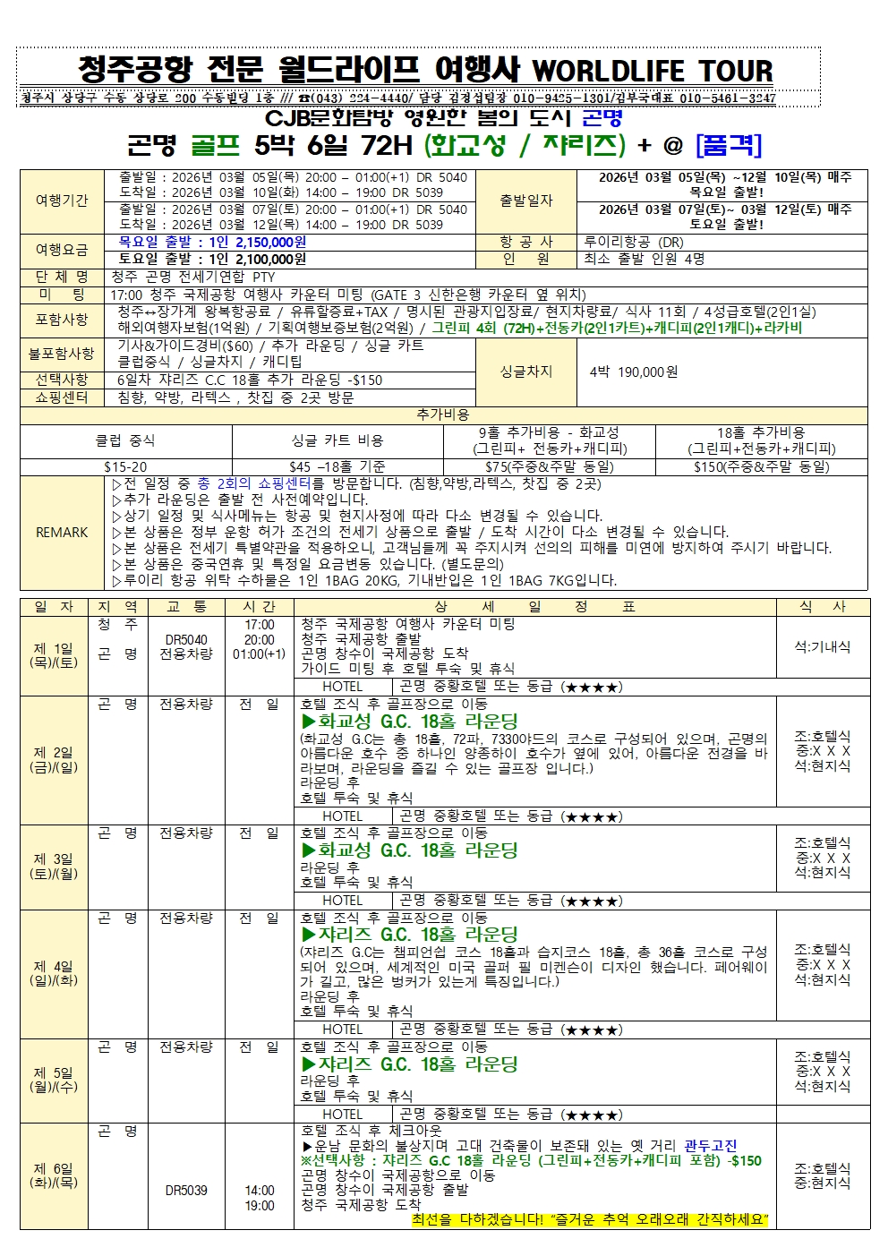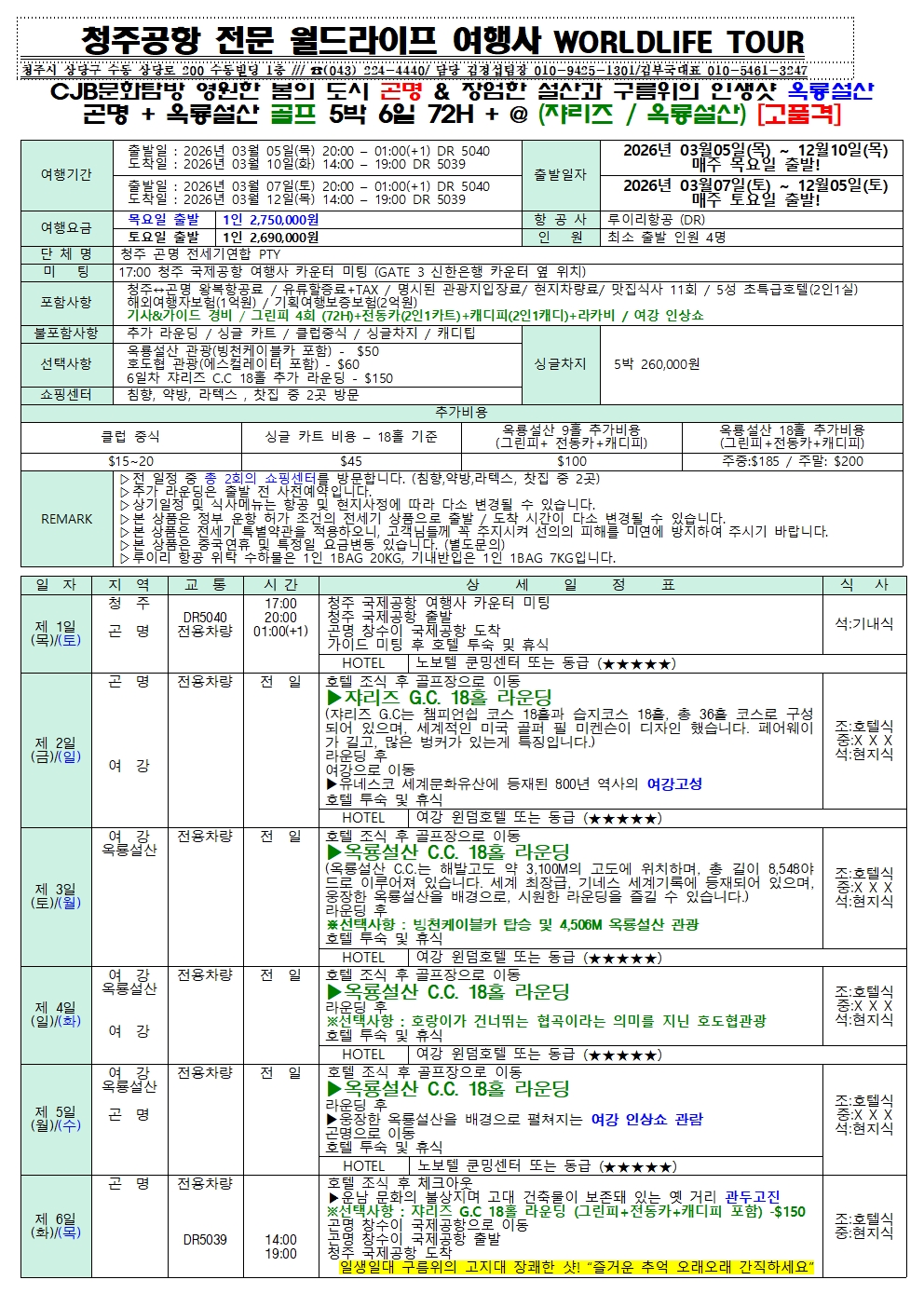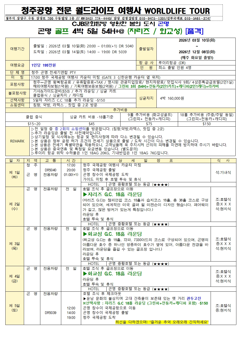 청주공항 2026년 3월-12월도 CJB문화탐방 4계절 꽃의 무릉도원 곤명 초특급 3-4색골프 & (쟈리즈+옥룡설산)CC 골프일정