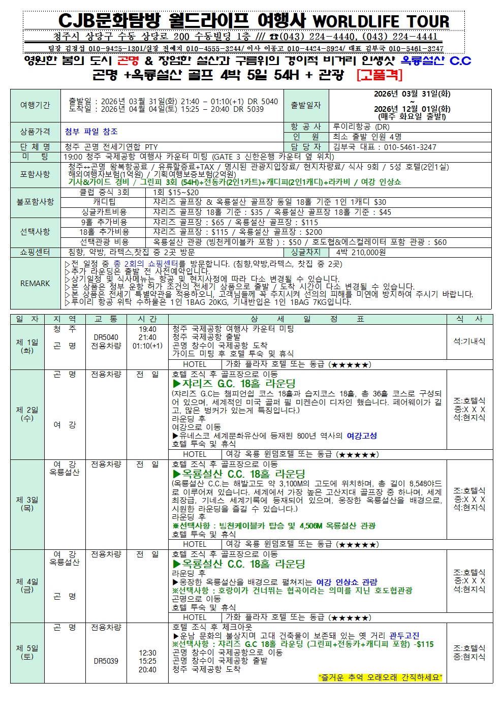 청주공항 2026년 중국골프성지 곤명직항 3-4색 초특급 골프 & 옥룡설산cc 놀라운비거리 샷체험 럭셔리 ...