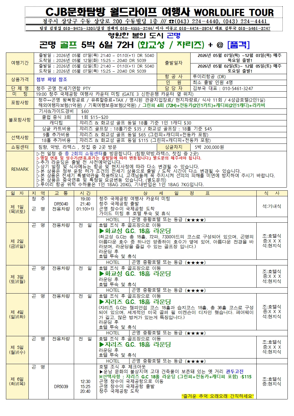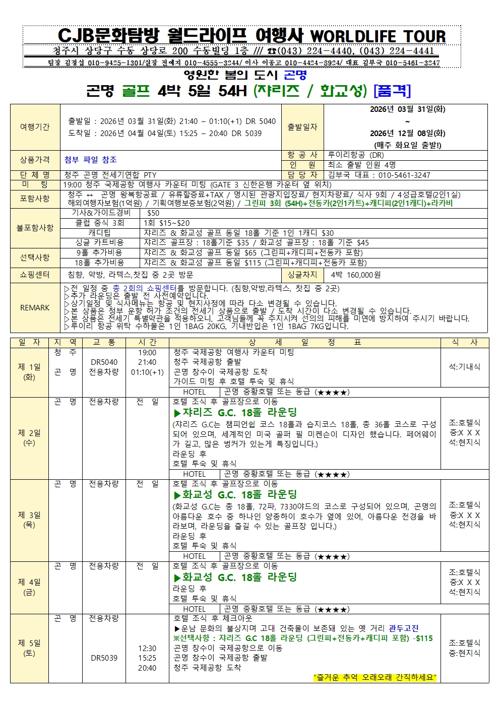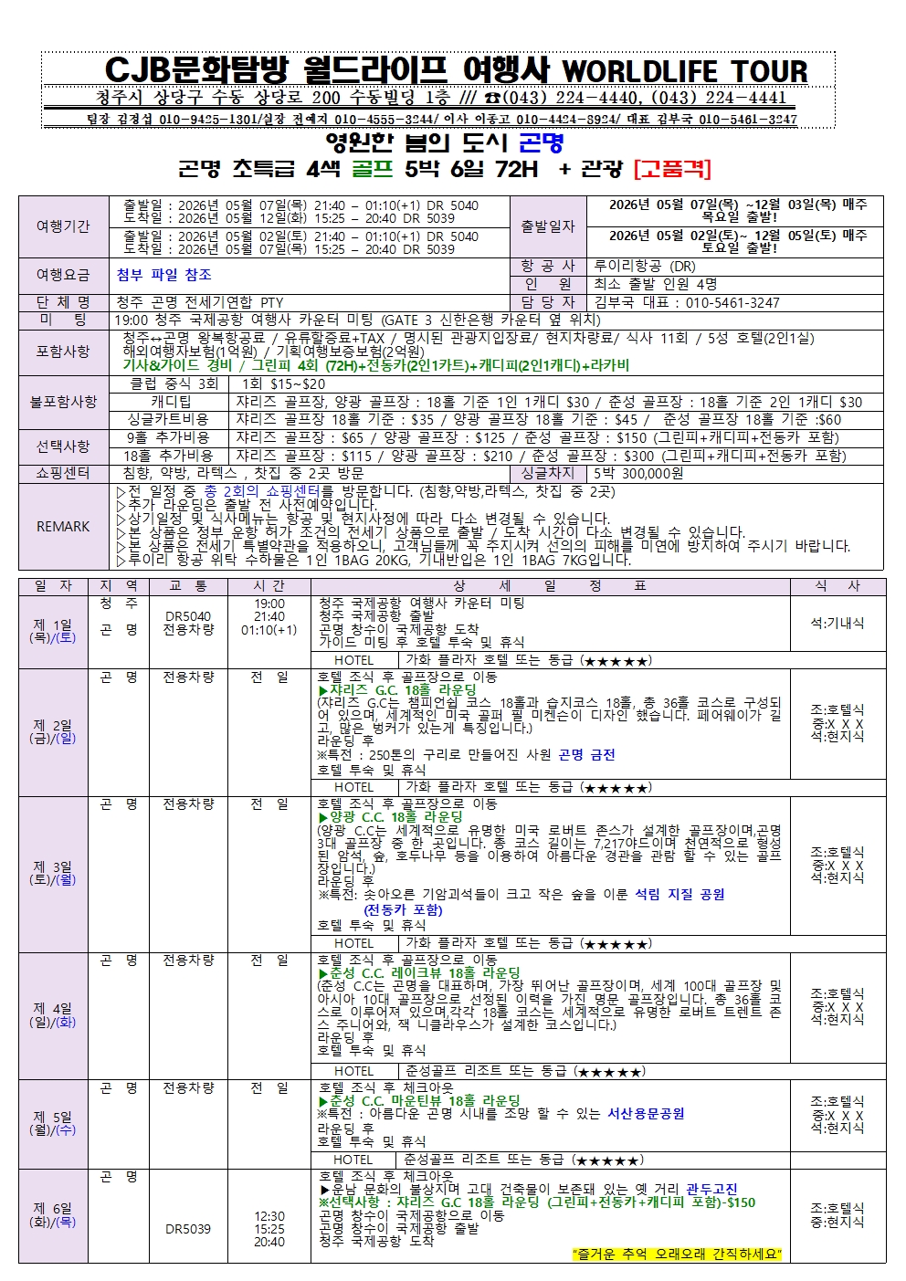 청주공항 2026년 중국골프의 성지 곤명직항 3-4색 초특급 명품 골프 &