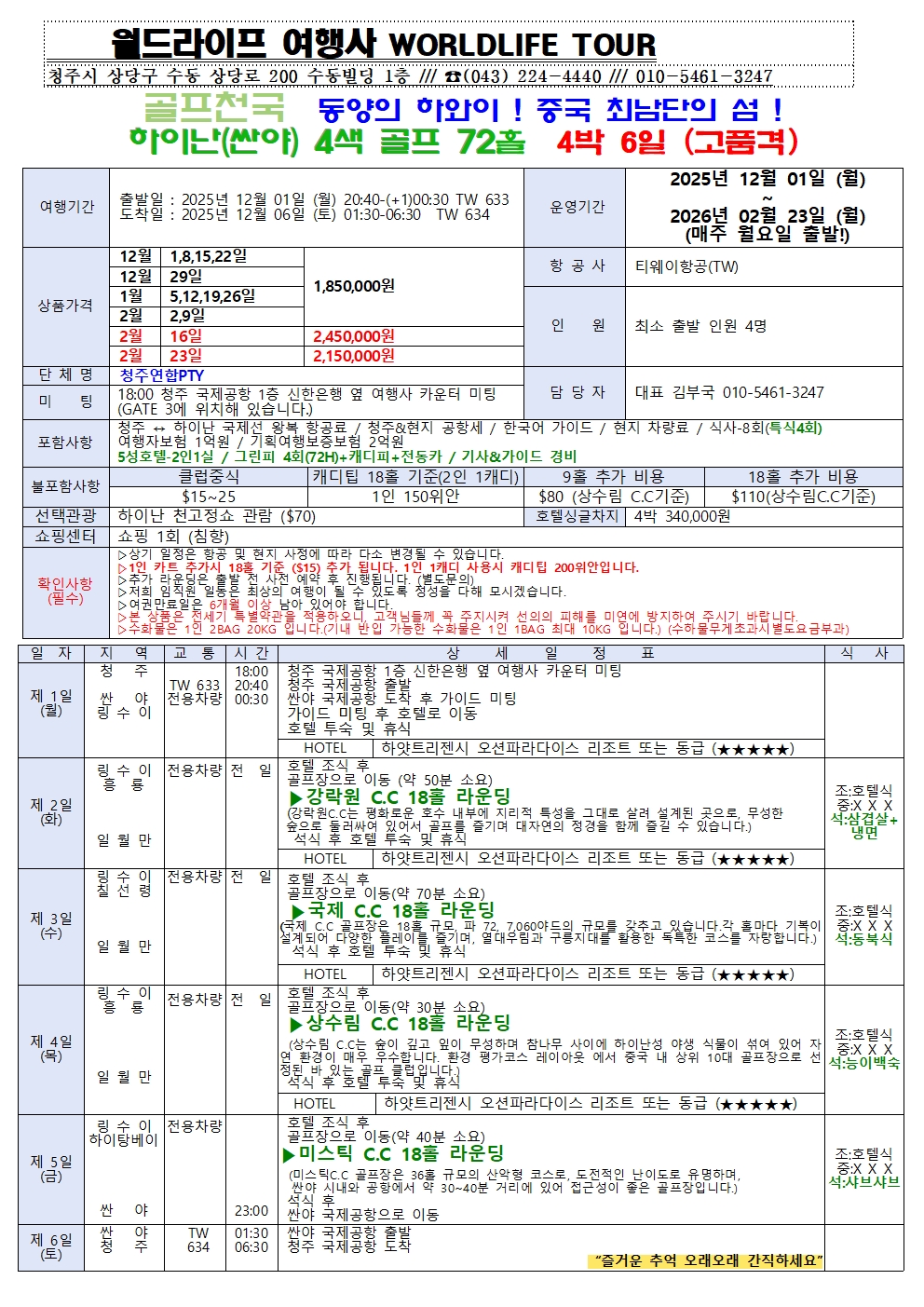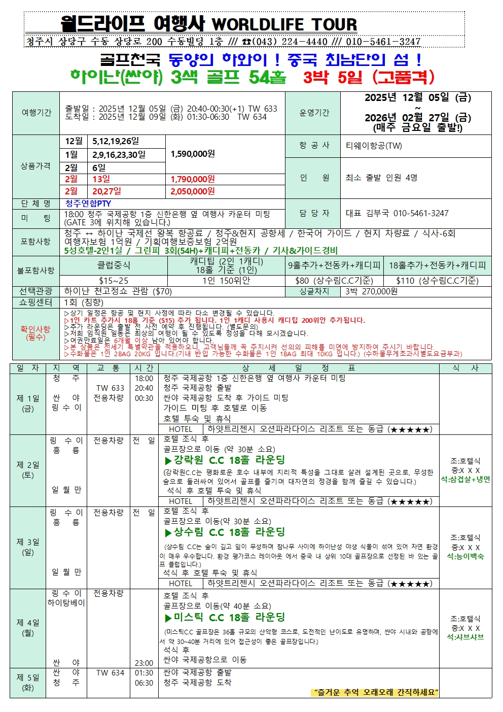 청주공항 동계 최적시즌 12-2월도 진행 골프천국 하이난 3-4색 명품골프 검증된 럭셔리 CJB문화탐방 일정 전국 예약센터 월드라이프여행사 043-224-4440