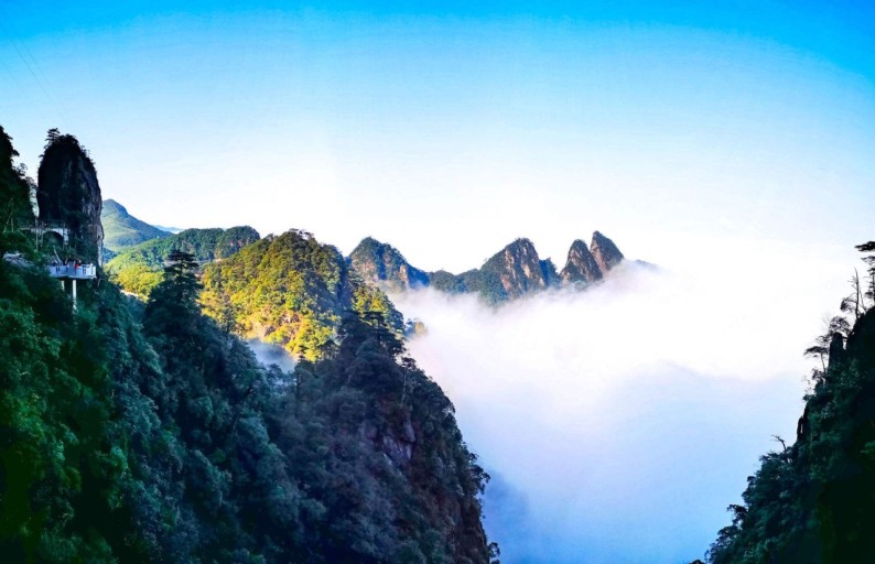 “국가삼림공원으로 지정된 망산은 사계절이 모두 아름답습니다. 봄에는 진달래가 피고, 여름에는 래프팅도 할 수 있으며 가을은 단풍, 겨울엔 중국 남부지방 유일의 눈꽃도 볼 수 있어 4계절 언제라도 찾아도 좋아요.” 라는 가이드의 설명을 들으며 한껏 기대감을 갖고 케이블카를 탔다. 총 길이는 3.7km, 상·하부 승강장 표고차는 1,000m에 달하며 탑승 시간만 20분이나 걸린다. 기압변화로 귀가 멍할 정도지만 발아래 펼처진 장관은 숨을 멎을정도로 대장관이 펼처진다.