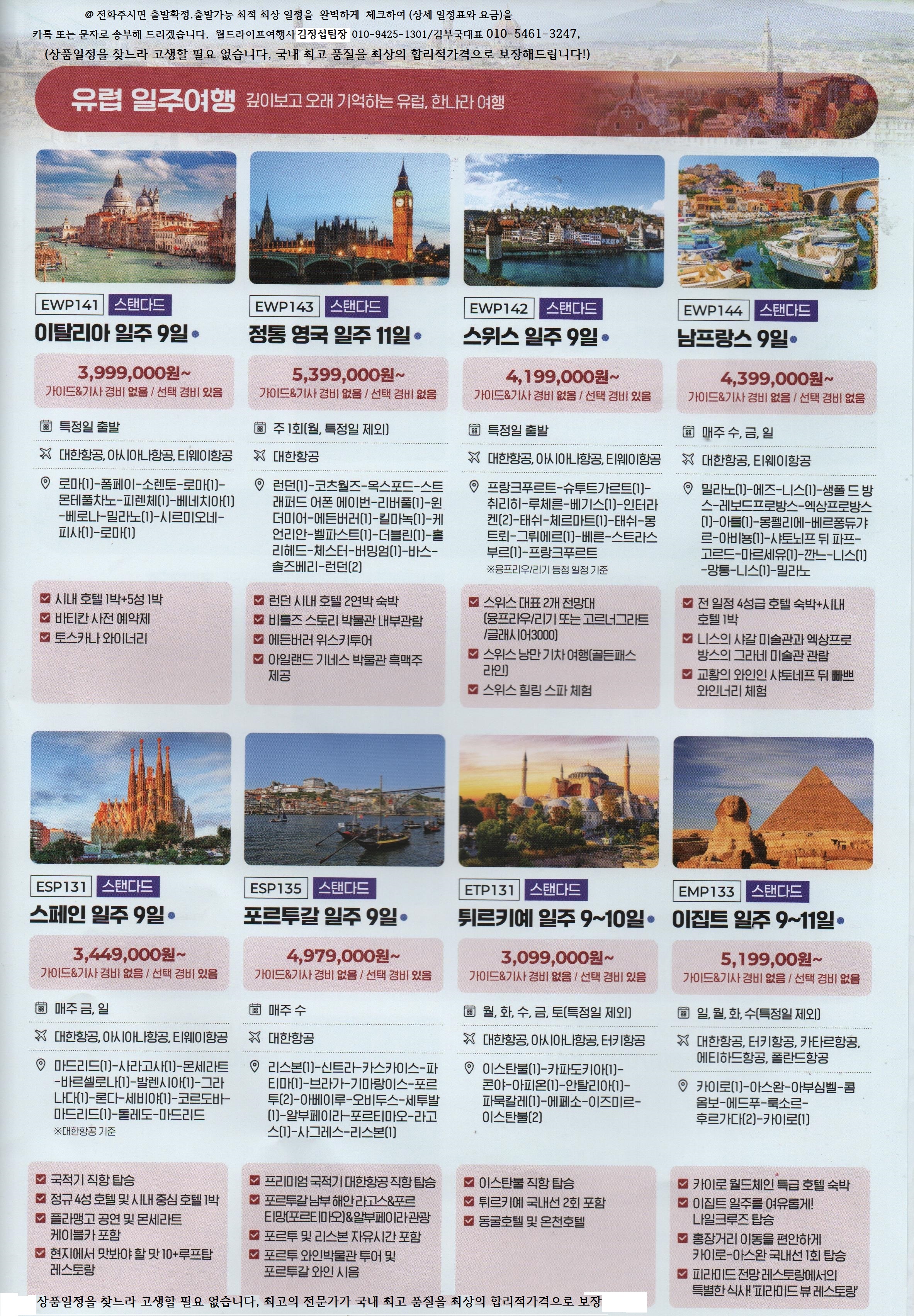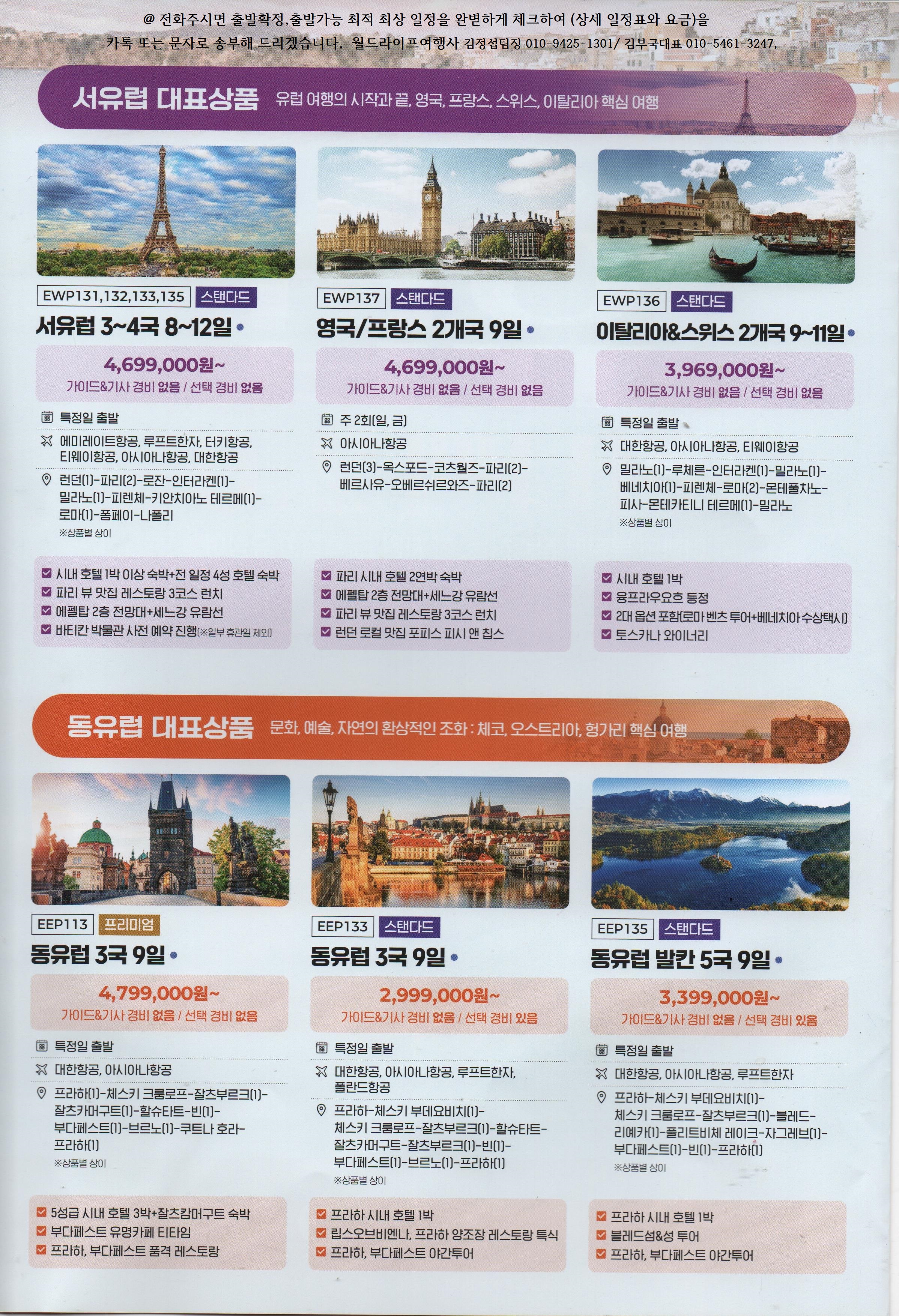 유럽 전지역 여행일정 안내 전국예약센터 , 전화주시면 최상,최적의 출발 확정일정을 체크하여 일정표와 요금을 문자나 카톡으로 알려드리고 있습니다, since 2002년 월드라이프여행사 김부국대표 010-5461-3247