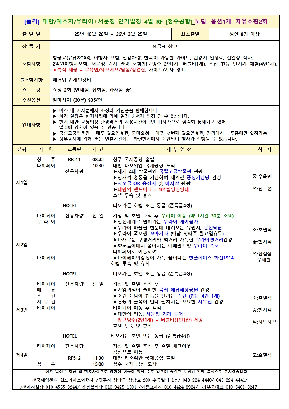 청주공항 대만 타이페이 3박4일 청주공항 최고인기 톱 베스트 예약진행일정 (동계시즌 포함 2026년 3월도까지 진행일정, 3월이후 출발문의도 환영) 전국예약센터 월드라이프여행사 043-224-4440