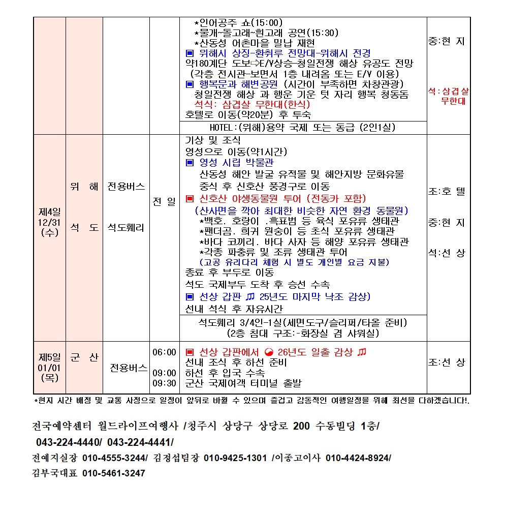 - 계절 시즌에 따라 일정과 요금이 다소 변동 될수 있음으로 확정 안내 드립니다!