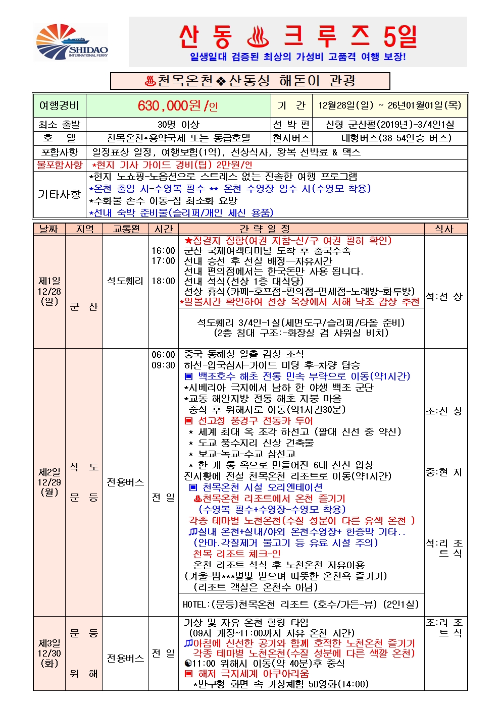 군산항 산동크루즈 여행 12월28일출발(해돋이관광), 1월4일출발(새해맞이), 4박5일 가성비최상 특급천목온...