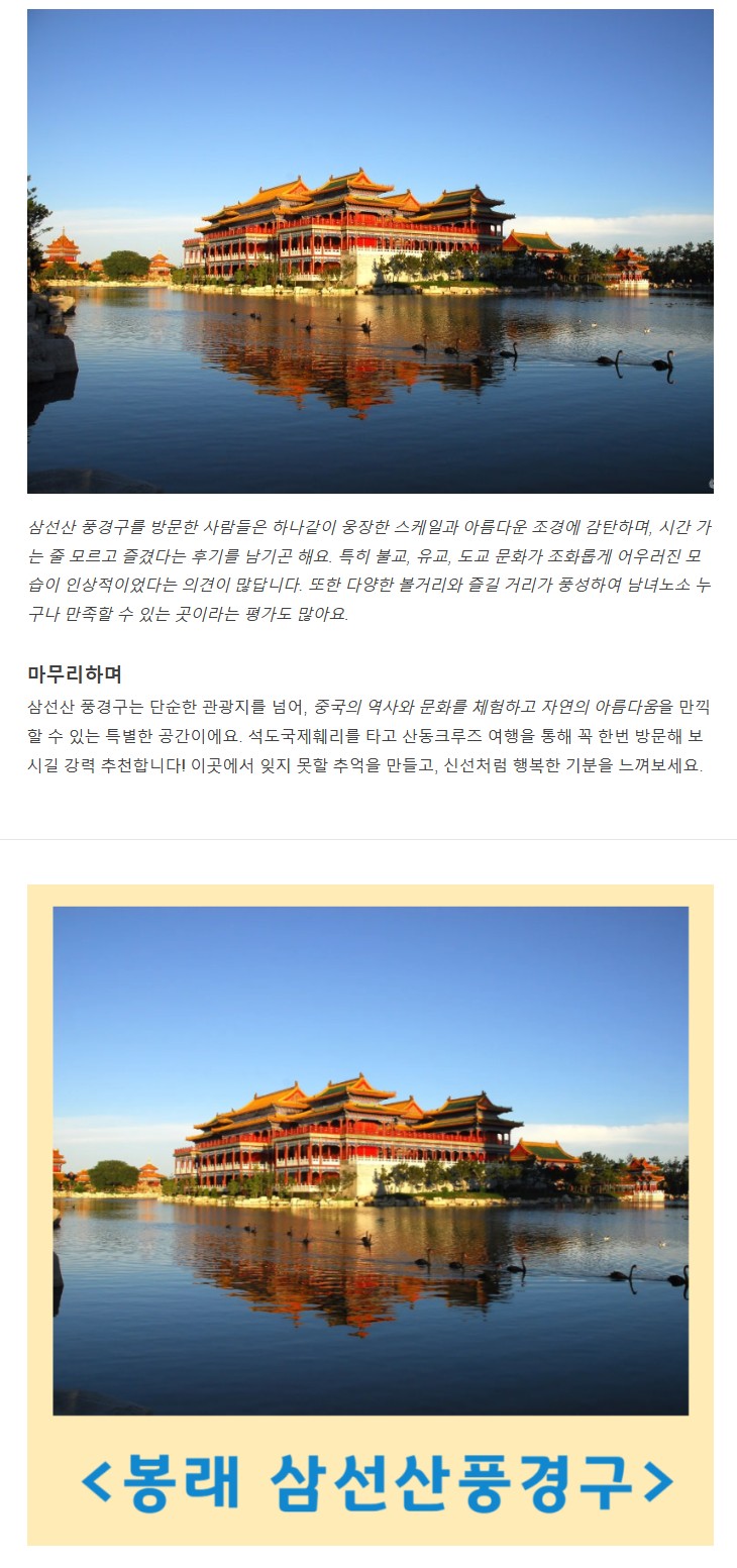 이들 여행지는 개별적으로 역사학, 인문학, 관광학적 가치를 지니고 있을 뿐만 아니라, 종합적으로 볼 때 동아시아 문화권의 해양문명과 대륙문명이 만나는 지점을 보여주는 살아있는 역사적 장소이며 증거입니다. 장보고 유적지는 해양네트워크의 역사적 실체를, 법화원과 봉래각은 종교적 사유의 공간적 확장을, 삼선산은 신화적 상상력의 지형학을, 극지해양수족관과 연태와인박물관은 현대적 과학기술과 전통의 결합을, 화하성풍경구의 웅장한 건축ㅁ불과 공연등은 인문학적 가치로 테마파크한 차원높은 상상력을 보여주고 있습니다.