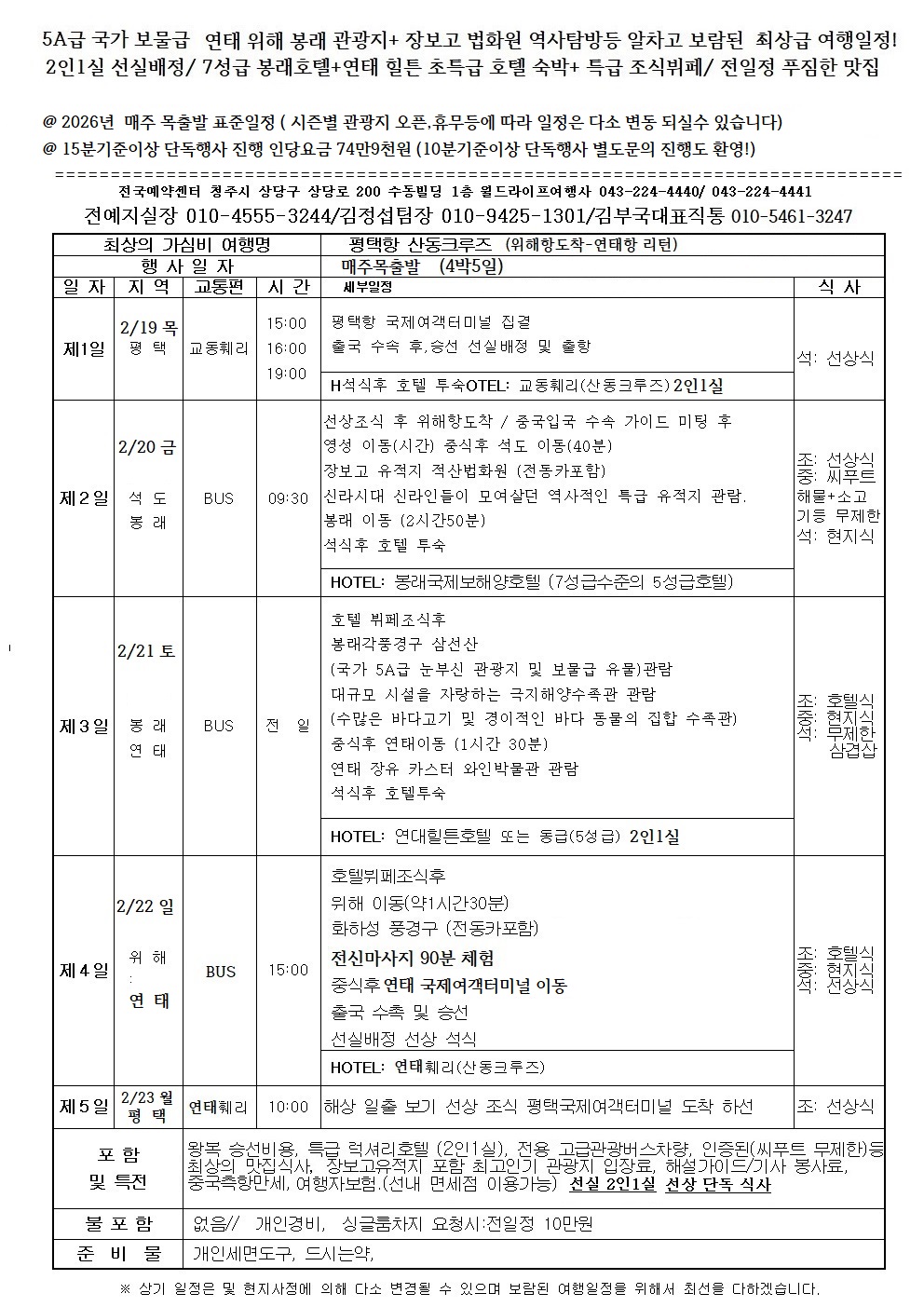 평택항 국제여객터미널 2026년 매주목출발 장보고 적산법화원+연태위해봉래 5A급 국가보물관광지 탐방 2인1실선실 7성급수준5성초특급 봉래호텔 연태힐튼 5성초특급 조식뷔페포함 푸짐한맛집식사(무제한 씨푸트+소고기식사,무제한 삼겹살 맛집식사) 국내(세상) 최상의 감격적 가성비 럭셔리여행 예약안내 전국예약센터 월드라이프여행사
