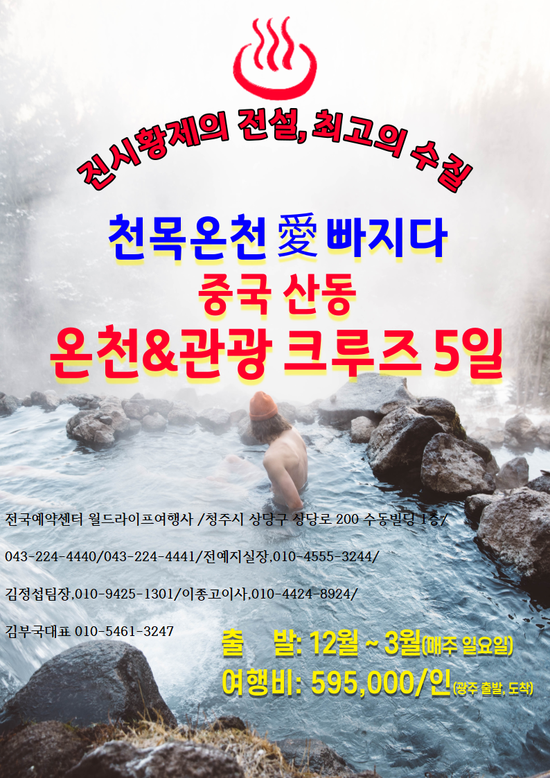 군산항출발 산동크루즈 중국 5A급 국가관광지 + (장보고유적지)등 검증된 최상급 럭셔리여행 가성비 초특급 천목온천호텔숙박욕 감격일정 전국예약센터 월드라이프여행사 043-224-4440