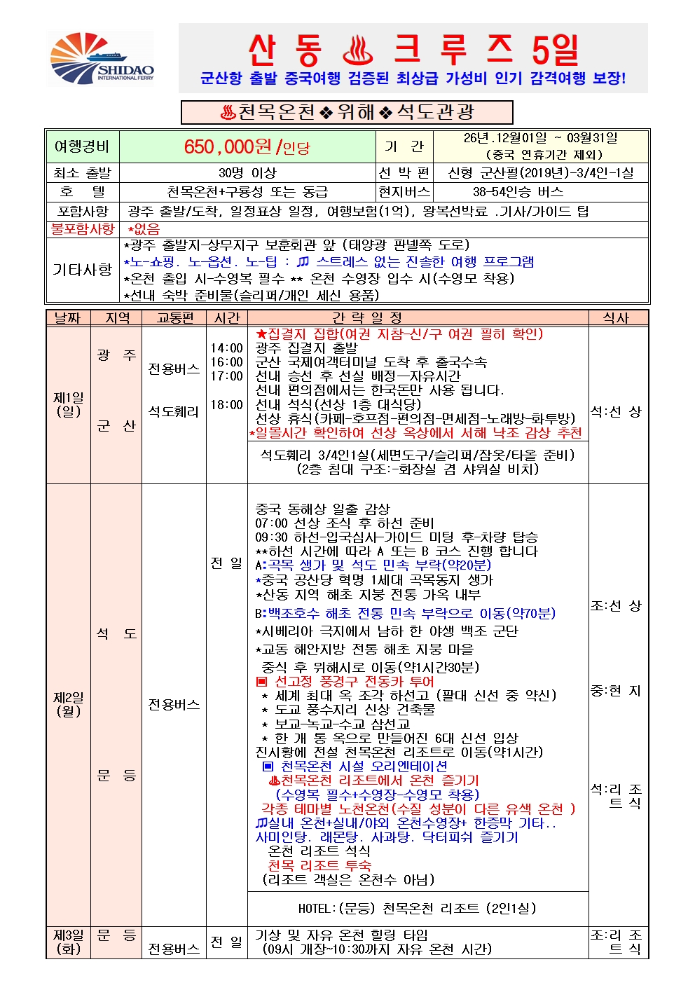 군산항출발 산동크루즈 중국 5A급 국가관광지 + (장보고유적지)등 검증된 최상급 럭셔리여행 초특급 천목온천호텔숙박