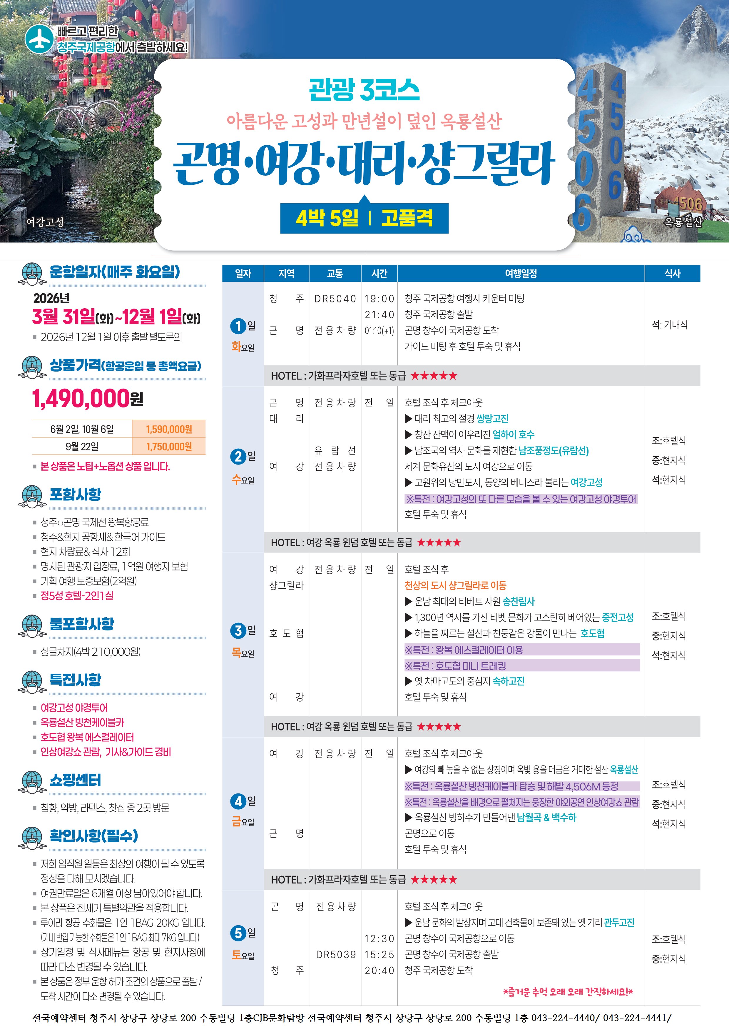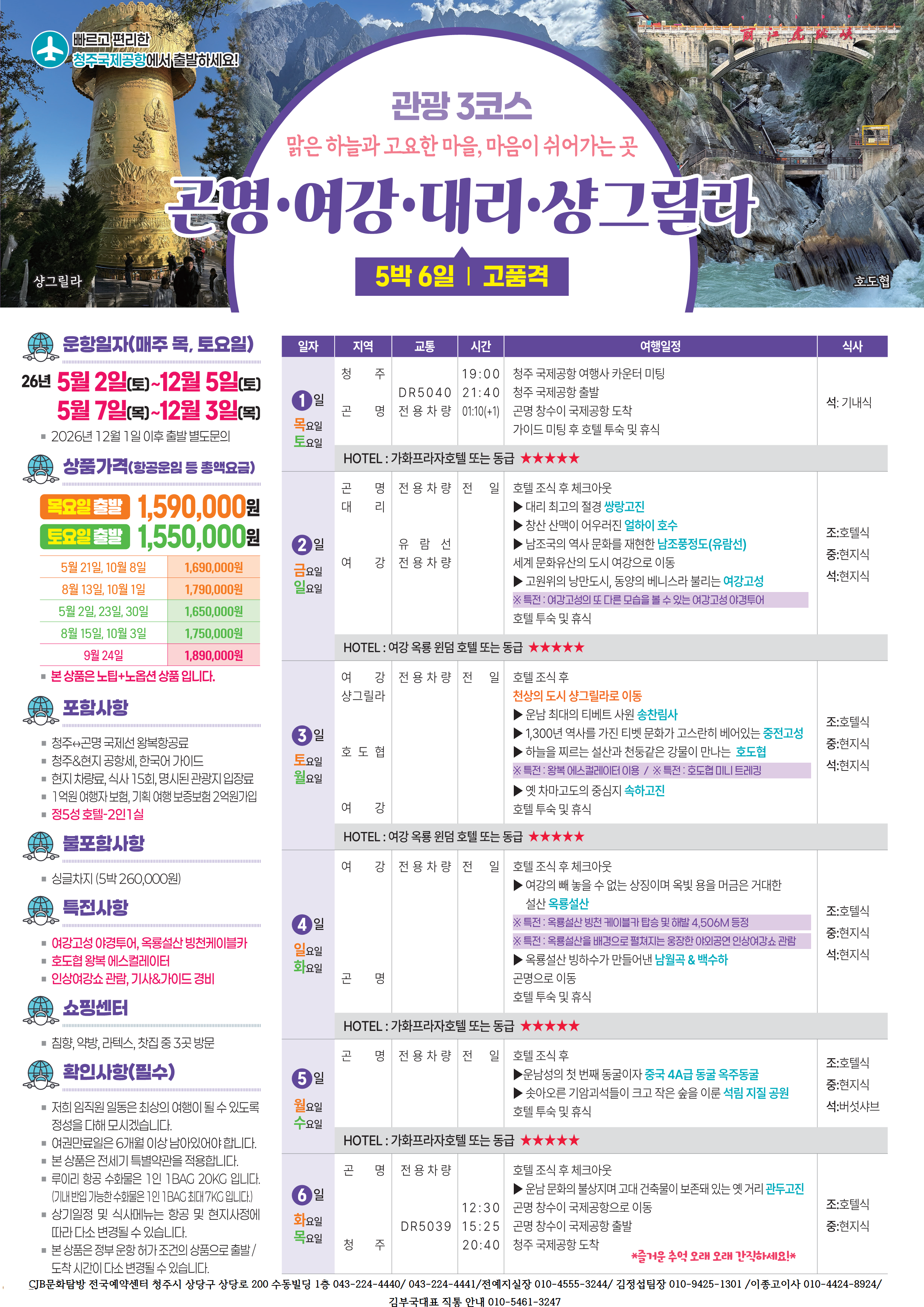 청주공항 곤명직항 여강 대리 샹그릴라 호도협 차마고도 옥룡설산 & 옥주(구향)동굴 석림지질공원 2026년 진행 검증된 럭셔리 CJB문화탐방 최상급 인문학 대경관 일생일대 끝판왕 여행 전국예약센터 월드라이프여행사 043-224-4440