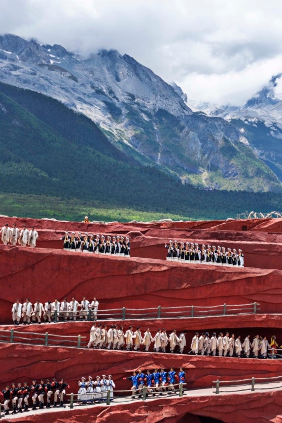 개요·연출: 장예모(張藝謀) 등 유명 연출진이 기획한 대형 야외 공연으로, 옥룡설산을 배경 무대화하여 지역 민속, 음악· 무용을 대규모로 재구성한 볼거리입니다. 관광 상품으로 고정된 공연시간과 좌석· 관람동선으로 현지안내하에, 리장 관광의 ‘하이라이트’ 명품 상품으로 크게 자리 잡았습니다.