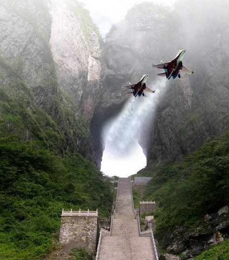 - **종교적 상징성**: 도교에서 추구하는 "천인합일(天人合一)" 사상의 공간적 구현으로, 하늘과 인간 소통의 장소로 신성시됨 . - **예술적 영감**: 1999년 외국 곡예비행팀의 동굴 통과이후 세계적인 명소로 부상하며, 인간의 도전정신과 자연의 장엄함이 교차하는 상징적인 공간으로 세계적인 명성을 얻고있습니다 .