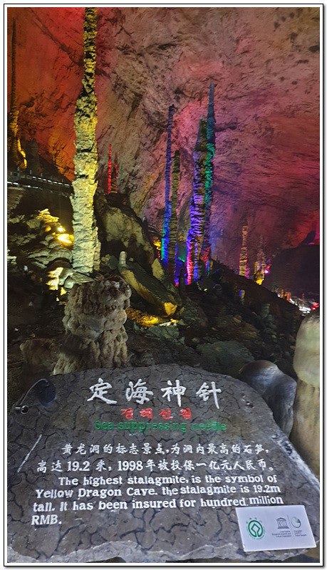 옛날 이곳에는 황룡이 살았었는데 백성들이 기름을 갖다 부어서 쫓아냈다는 전설도 있다. 동굴 안의 세계는 그야말로 거대한 지하 별세계를 이루고 있어 동굴 안으로 들어갈수록 아름답고 고요한 절경이 극치의 경지에 이르는 것 같았다. 천여 개의 석봉과 석주는 마치 석림(石林)과도 같은 대장관을 이루고 있었고 정해신침(定海神針)이라는 가장 멋있고 높은 석순은 높이가 무려 19.2m에 달하고있으며 현재도 계속 커가고있다.