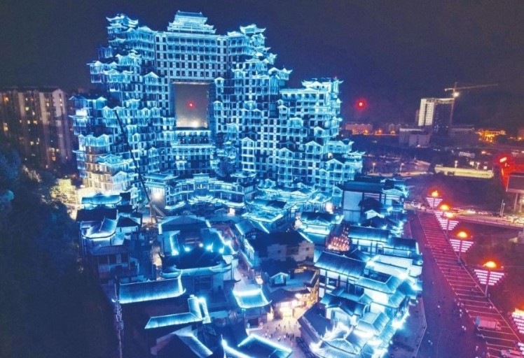 - 전체적으로 토가족(土家族)과 묘족(苗族)의 전통 **"각루(吊脚楼, 다리 건축)"** 양식을 현대적으로 재해석했다.