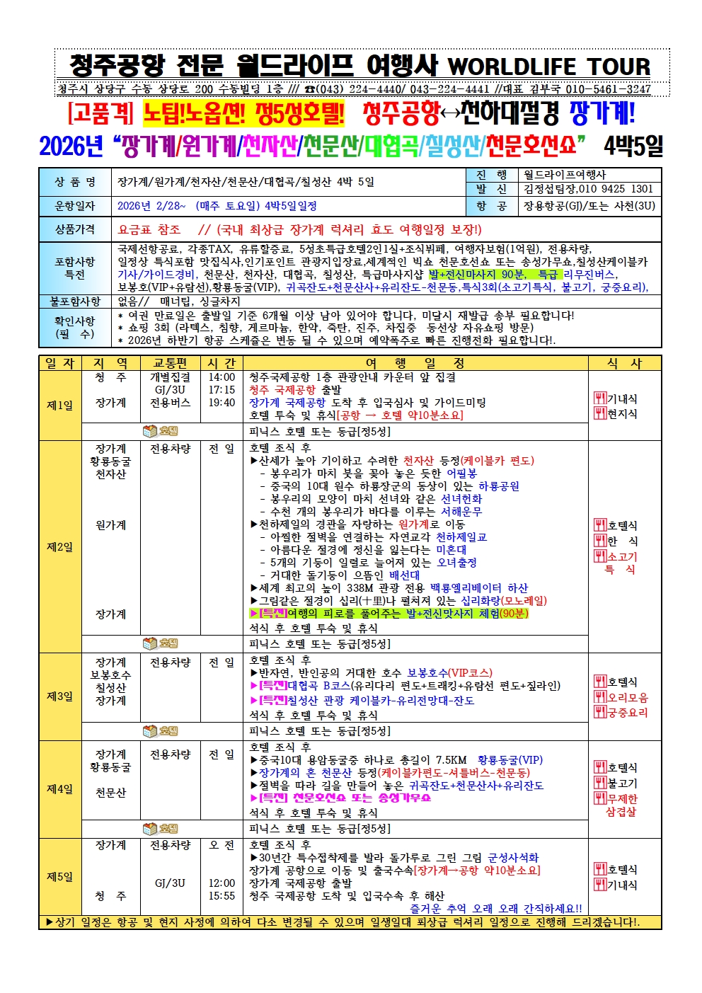 청주공항 2026년 천하절경 장가계 전국 각 TV문화탐방 검증된 최상급 럭셔리 여행보장 효도 초특급일정 전국예약센터 전국예약센터 월드라이프여행사 043-224-4440