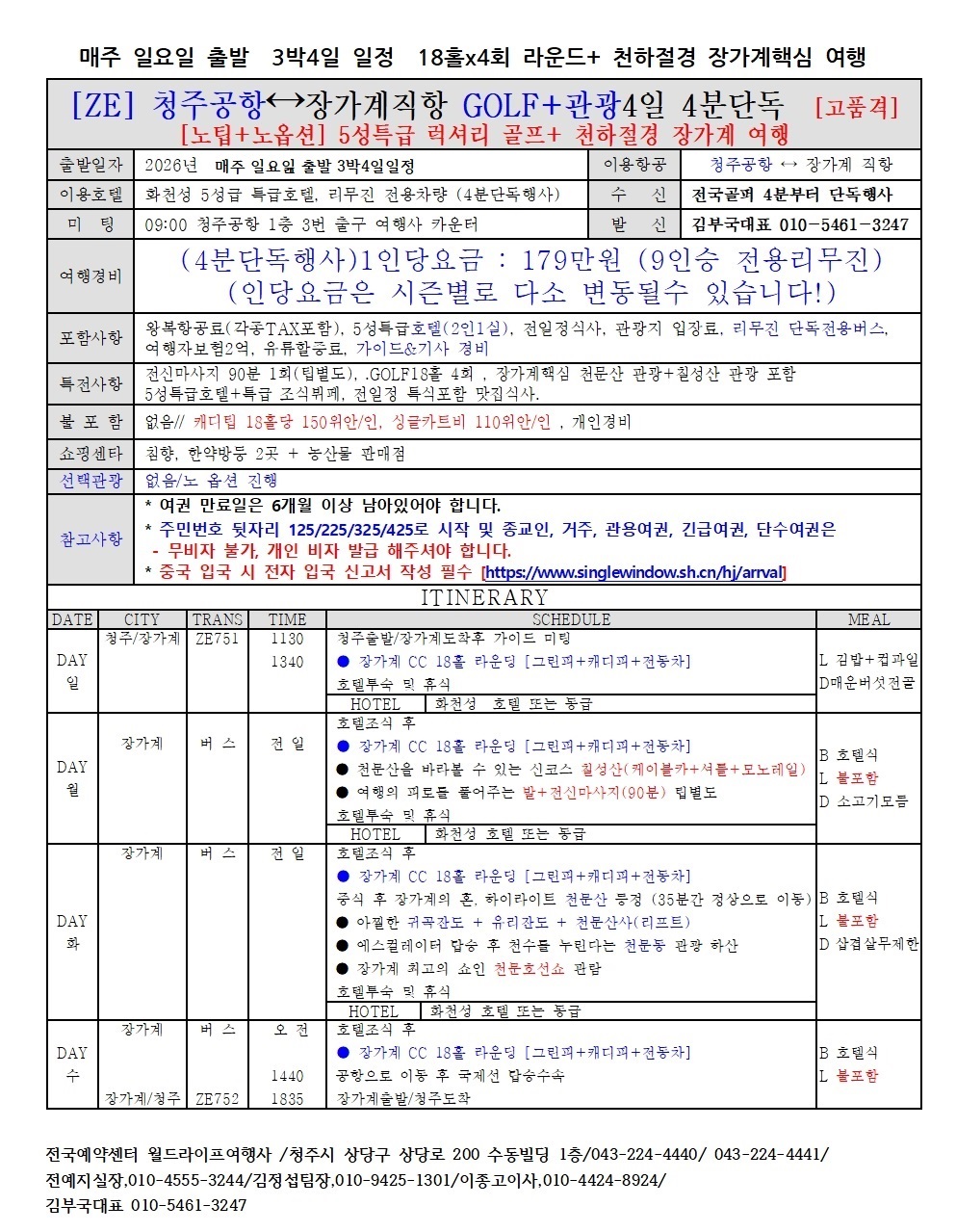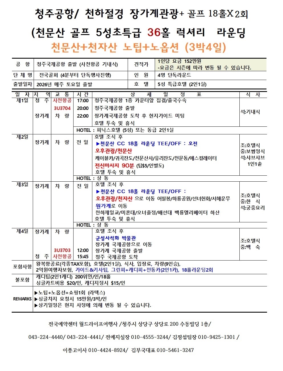 청주공항 천하절경 장가계 관광하고 세계최고 경관코스에서 골프라운드하고 심신치유 마사지 받고 푸짐한식사 즐기는 럭셔리 골프+관광인기최상 골퍼 들의 일생일대 여행 전국예약센터 월드라이프여행사