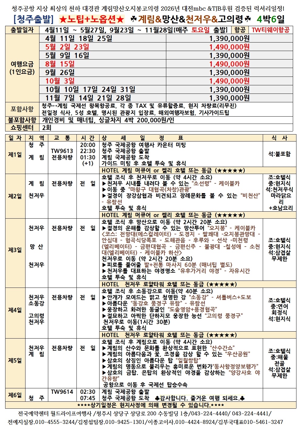 청주공항 지상 최상의 천하 대경관 계림양삭여행 2026년 대전mbc &TJB후원 검증된 럭셔리일정 전국예약센터