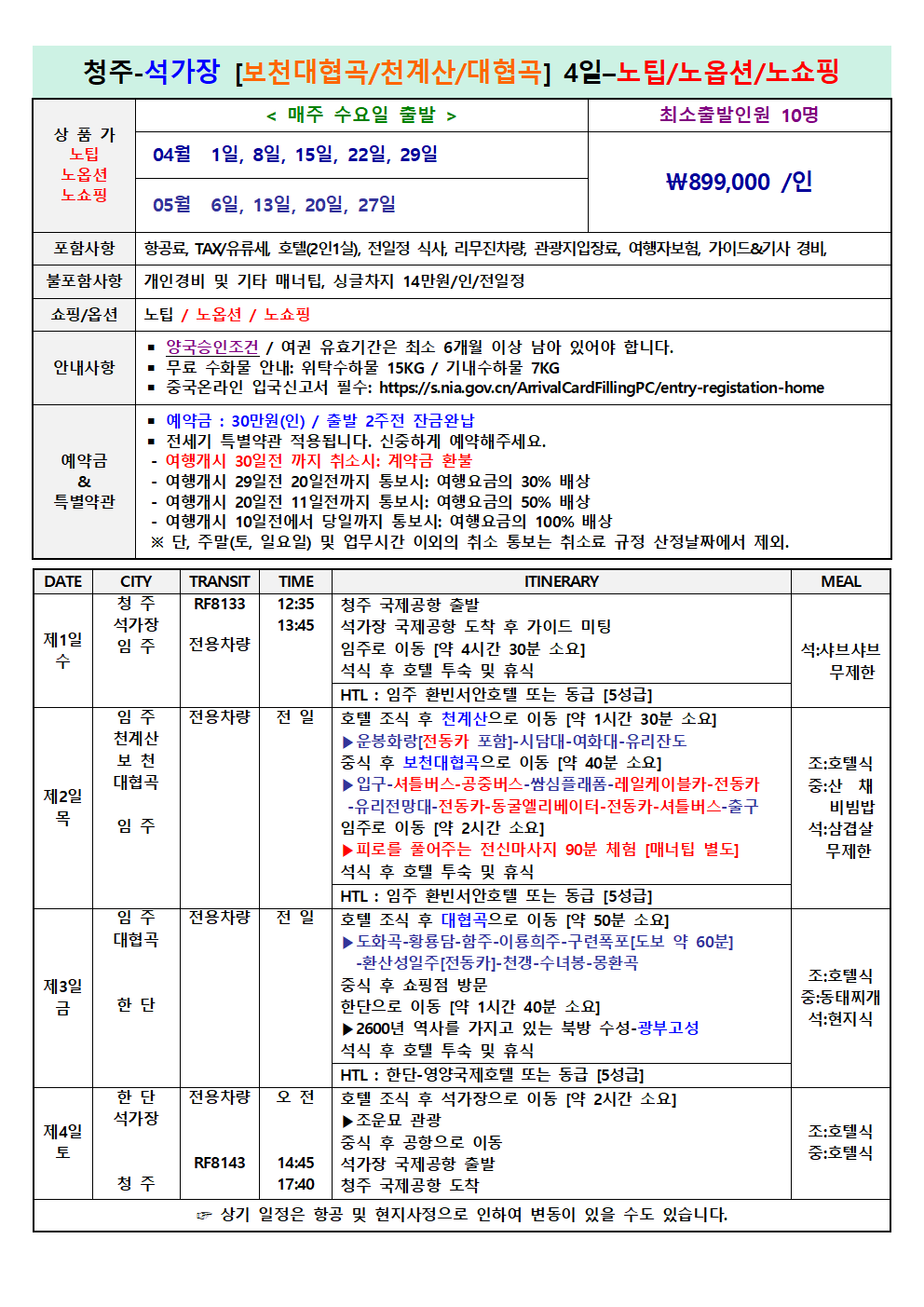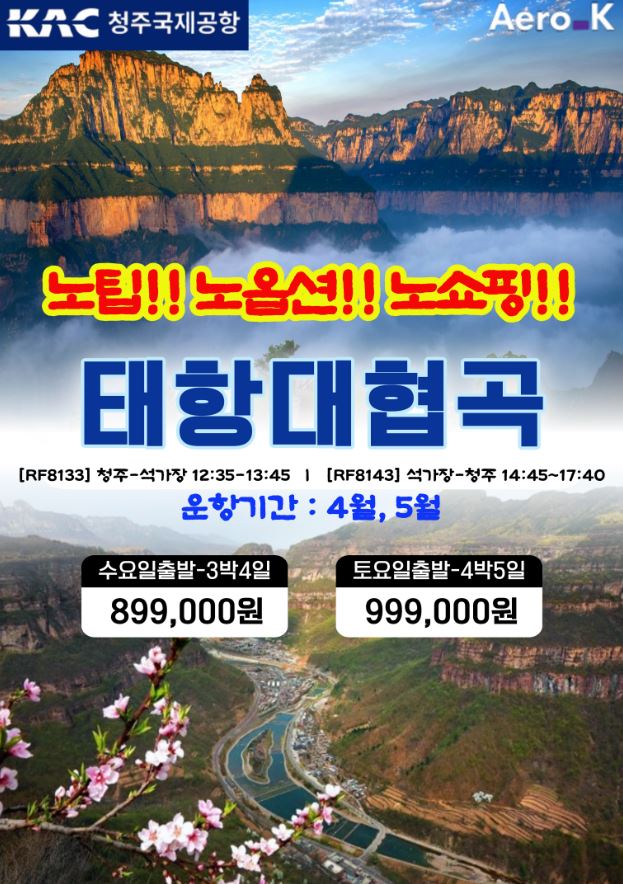 본 청주공항 태항산 패키지 일정은 공인된 최적의 대경관 코스이며 전일정 초특급 5성호텔과 조식뷔페, 특식포함 맛집식사 제공등 검증된 최상급 럭셔리 특가일정임으로 감격일정의 보람을 만끽하실수 있을것입니다...