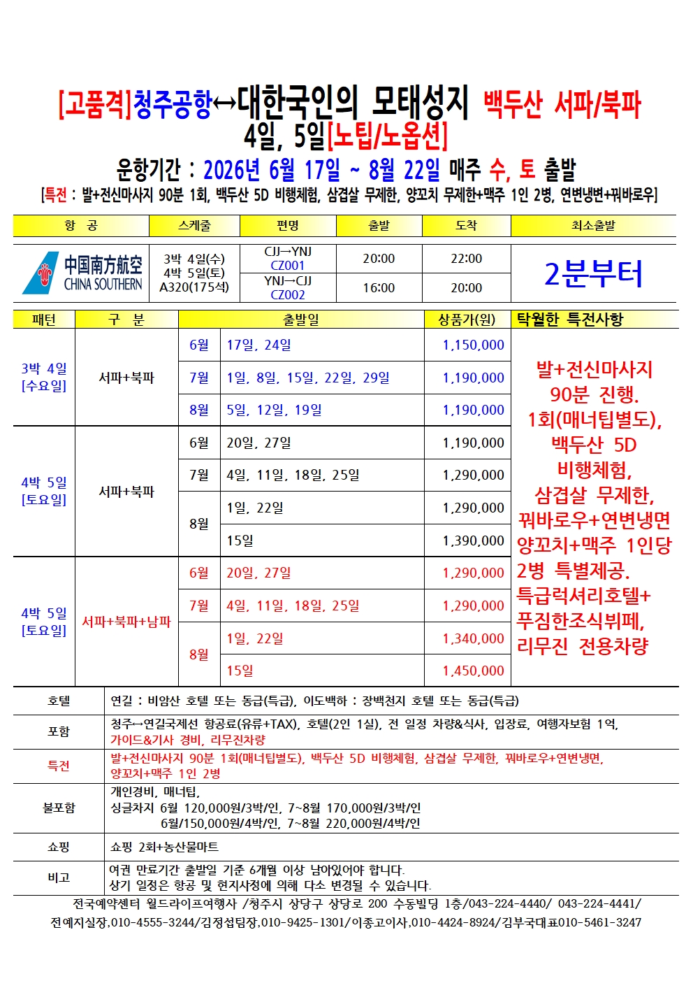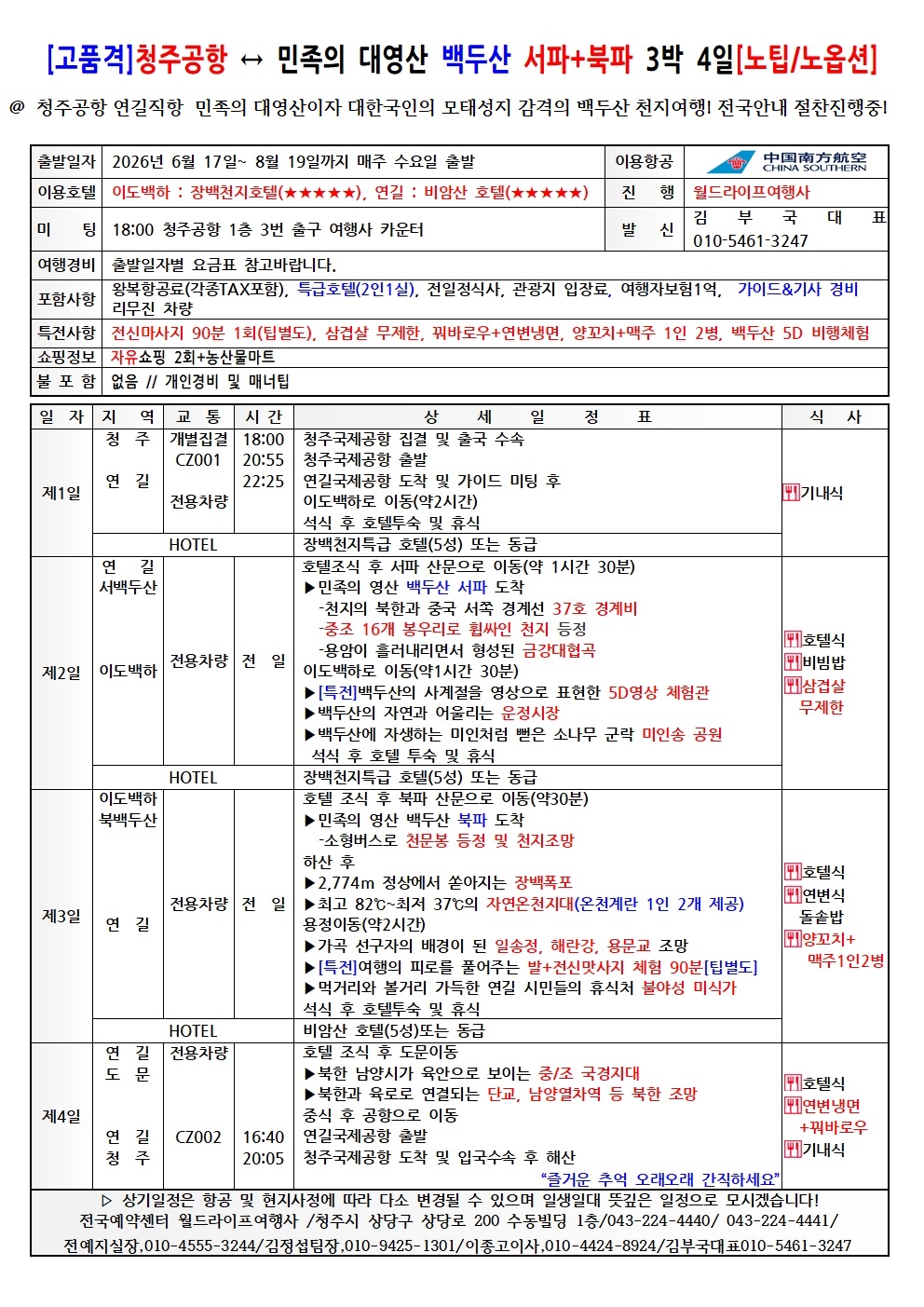 대한국인이 정체성을 확인하기위해 수없이 찾아가는 한국인의 모태성지 청주공항 백두산 천지여행 서파+북파+(남파)여행 2026년 남방항공 6-8월도 최적시즌진행 (윤동주 생가 서북파 4박5일일정 방문) 전국예약센터 월드라이프여행사 043-24-4440
