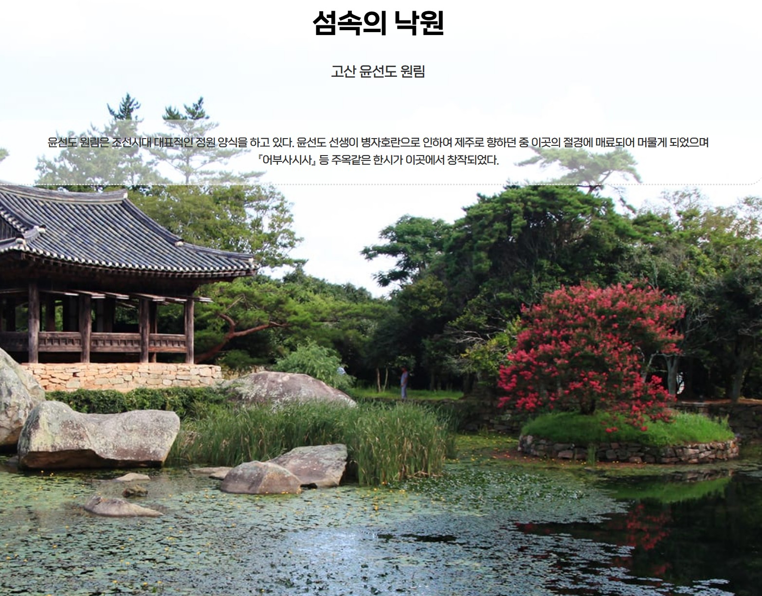 보길도는 고산 윤선생의 문학적 업적과 함께 조선 시대의 정원 문화를 엿볼 수 있는 곳입니다./ 보길도에는 고산 윤선도 선생의 흔적이 남아 있는 다양한 유적지가 있으며, 이는 조선 시대의 역사와 문화를 이해하는 데 커다란 도움을 주는곳입니다.