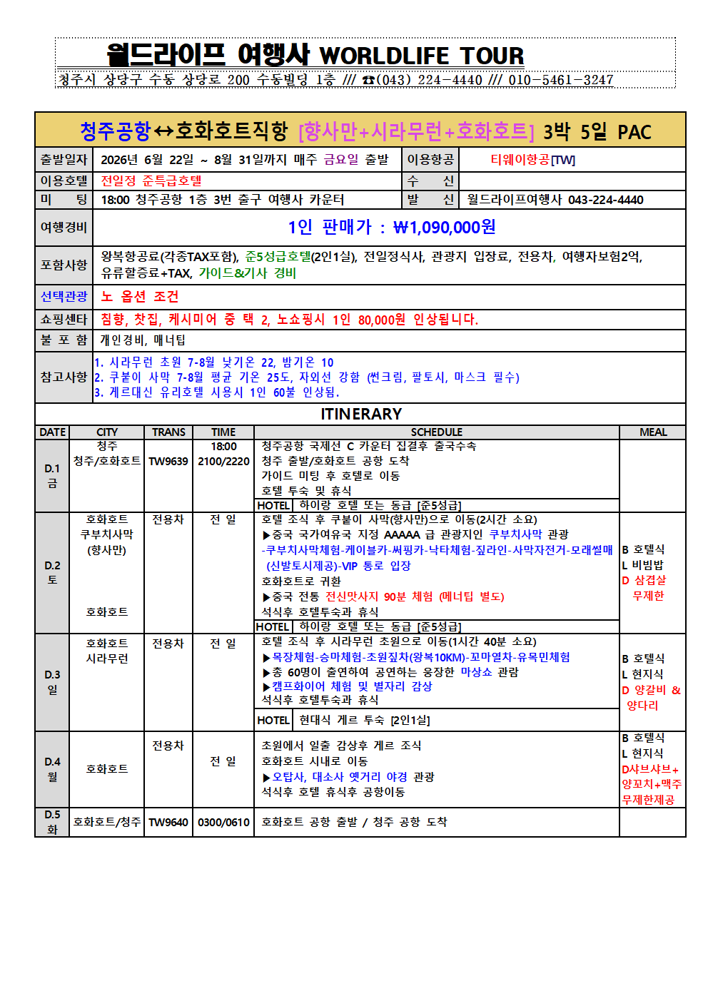 2026년 청주공항--호화호트(TW항공)고품격/노팁/노옵션 3박5일(금요일)4박6일(화요일)전국예약센터