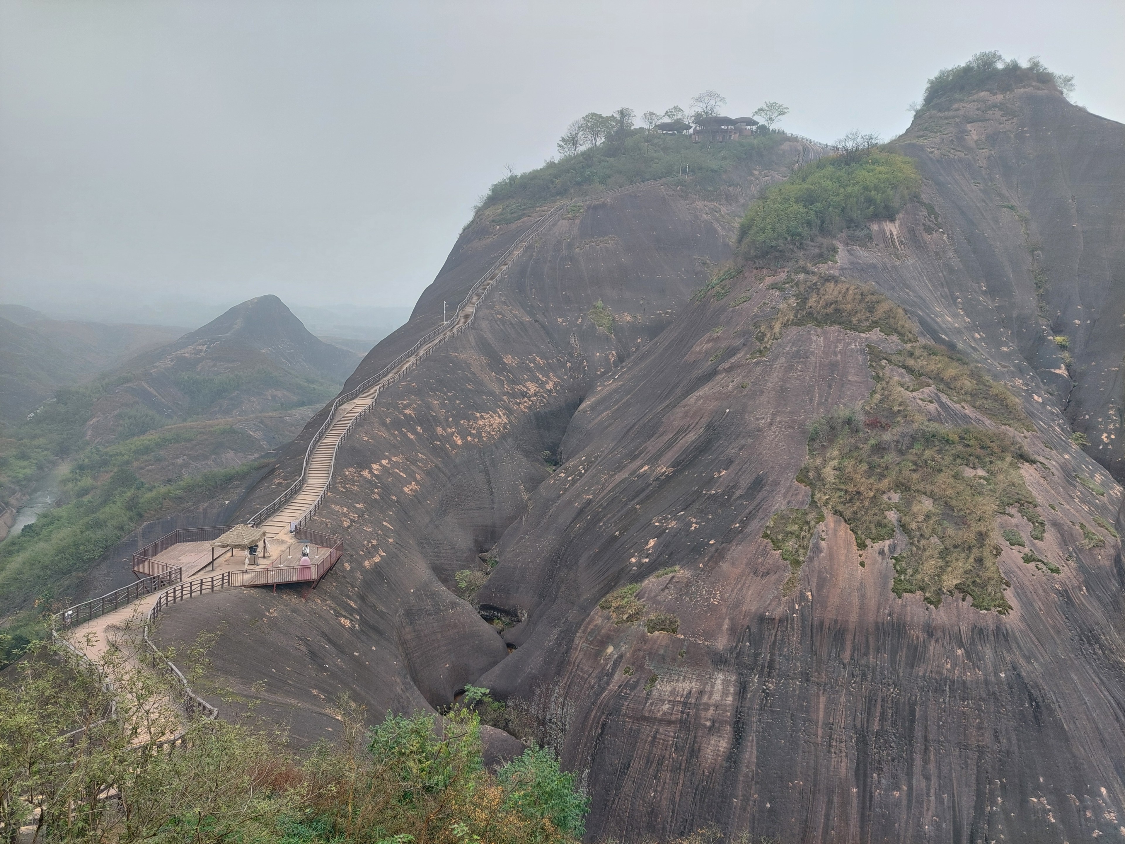 식당 뒤편 계단을 따라 소천대를 향해 200m쯤 고도를 높인다. 안타깝게도 다시 소천대는 안개에 휩싸인다. 케이블카 승강장으로 돌아가기 위해 오른편으로 발걸음을 돌린다. 기암절벽의 모양에 따라 이름 붙여진 신귀망월, 금편협곡, 신귀출해, 금편신주, 칠성대 등 탁월한 경관의 명소들이 신비하고 오묘한 모습으로 나타났다 사라지기를 반복하다보니, 안개 운무로 인하여 자연현상에 따른 신비로움은 또다시 절로 신선이 된 느낌이라 할 것이다.