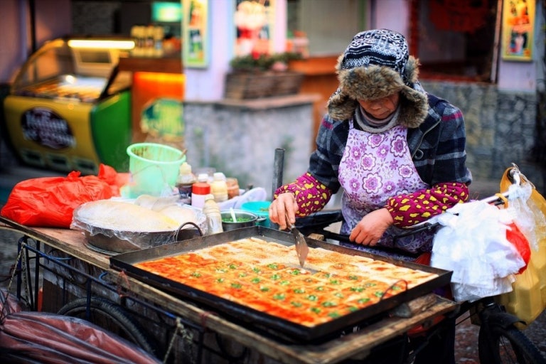 야시장에서는 천저우·절강성의 전통 먹거리와 수공예품을 판매하여