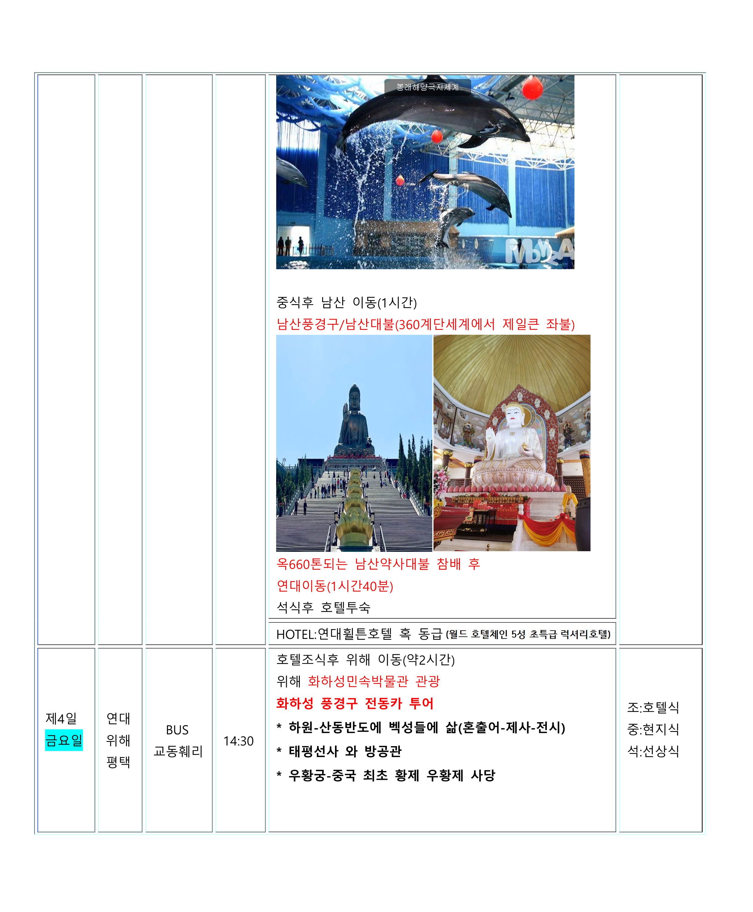 평택항 산동성 위해 연태 봉래 (남산대불 포함) 4박5일일정 지상안내문,