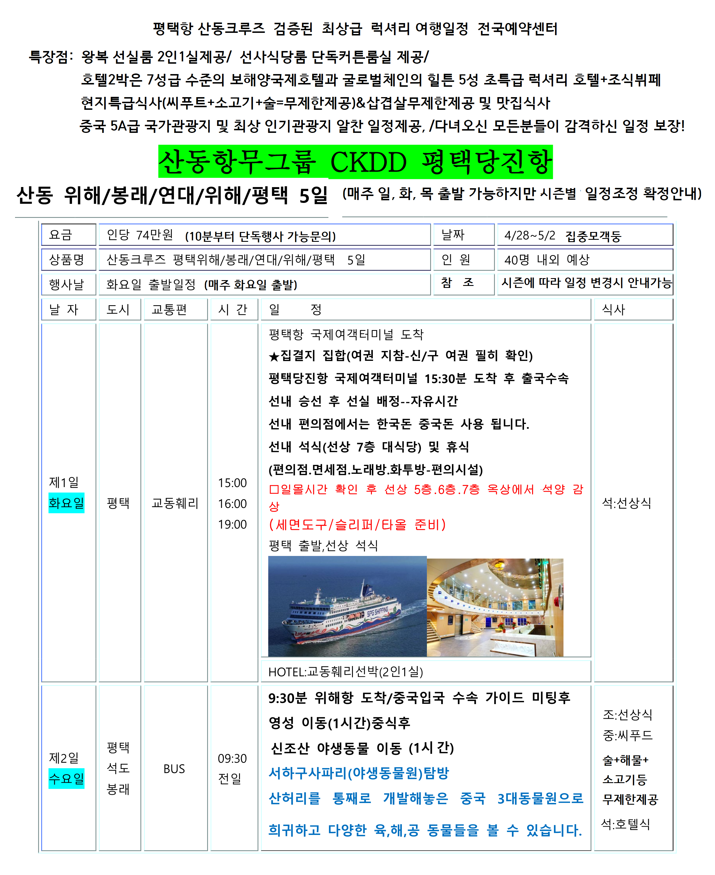 평택항 산동크루즈 4박5일 여행일정을 다녀오신 모든분들이 일생일대 감격적인 럭셔리 최상급 낭만여행 일정을 즐기셨다고 이구동성으로 감격하셨다고 말씀하시는 국내 중국여행중, 초특급 가성비 최상 일정을 보장하고 있습니다!