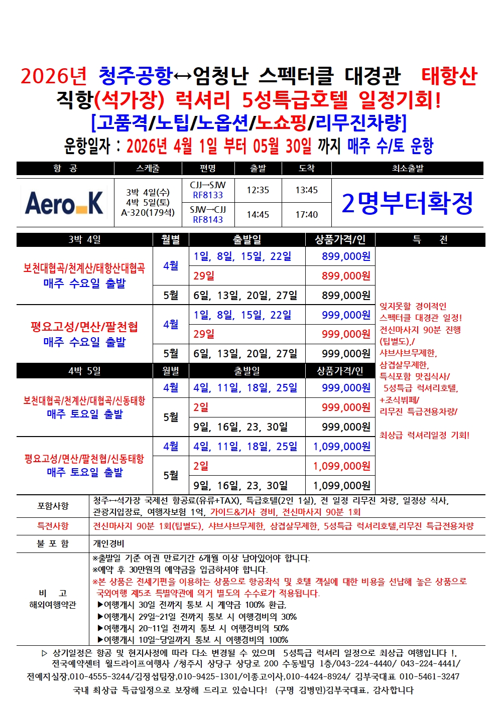 일정표상 4가지 일정중 선택한 일정내용, 지상안내 내용 보시고 출발일자 선택하여 진행인원 알려주시고 여권촬영하여 송부해주시고 아래폰으로 전화주시면 여행확정서로 인당 예약금 30만원 송금안내등 다녀오실때가지 가슴이 펑 뚫리는 스펙터클한 대경관, 대장관의 일정을 5성특급호텔의 럭셔리 일정으로 진행 안내드리겠습니다.