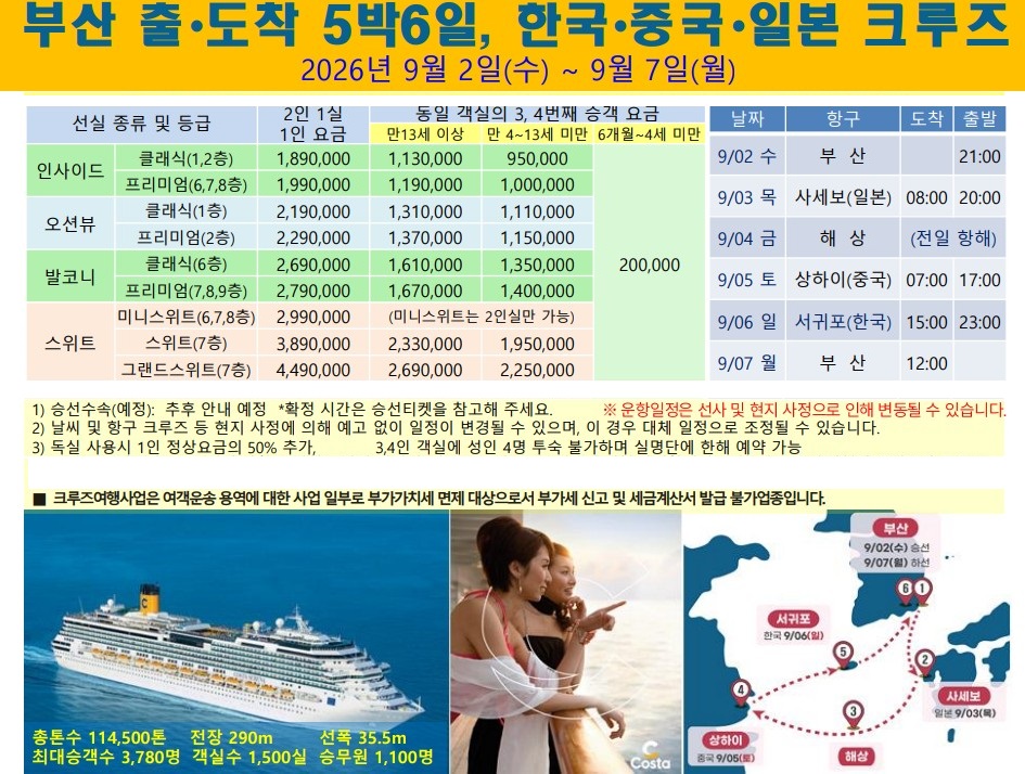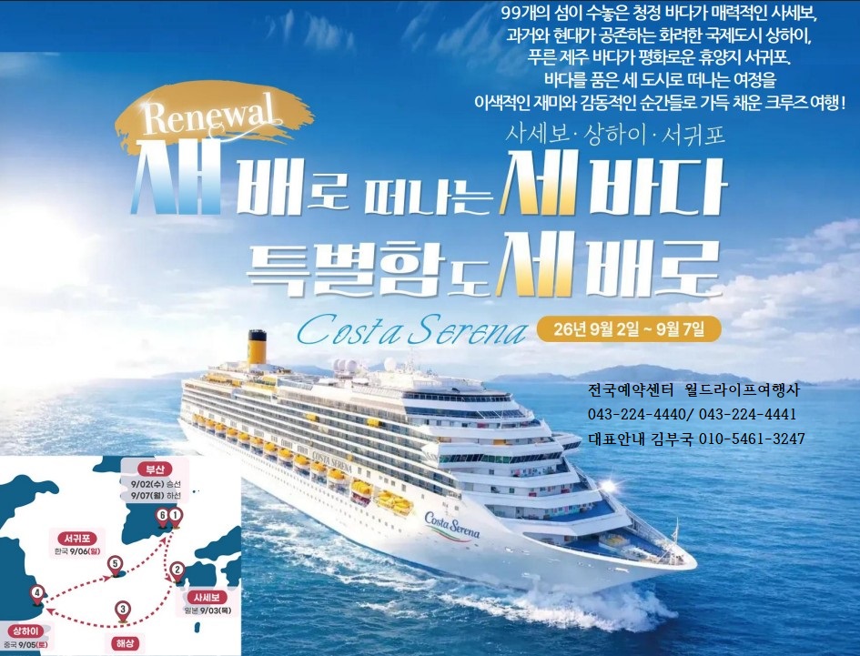 전세계인이 열광하는 지상최고의 초호화 초특급 크루즈 여행일정! 인생 모든여행의 끝판왕 코스타세레나 초호화 초특급크루즈 2026 9월2일 부산출발-사세보-상해-서귀포-부산 5박6일 3국 럭셔리 일정 진행기회 전국예약센터월드라이프여행사 043 224 4440