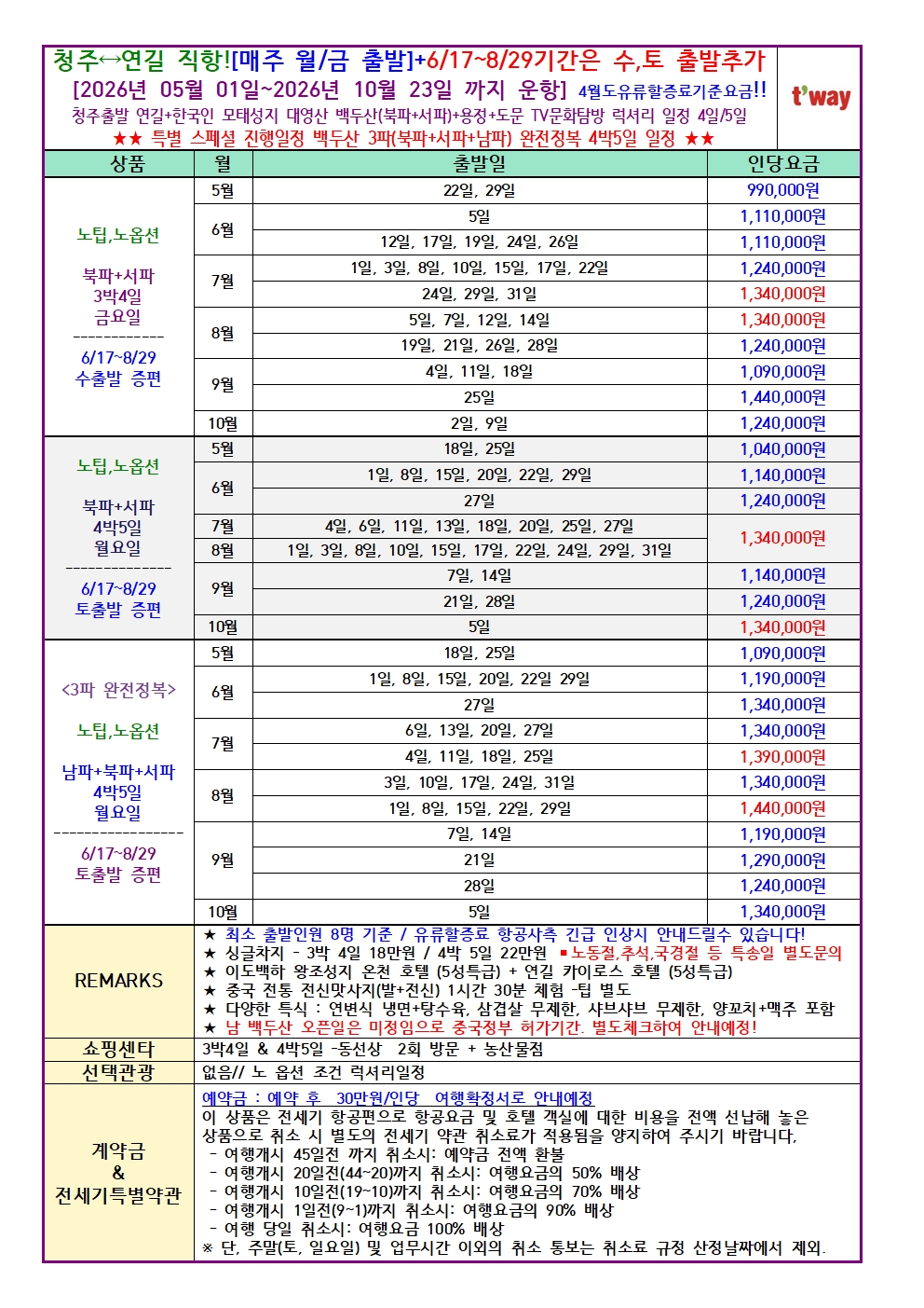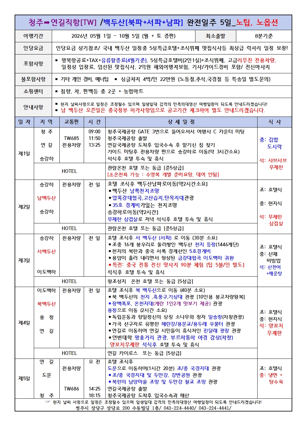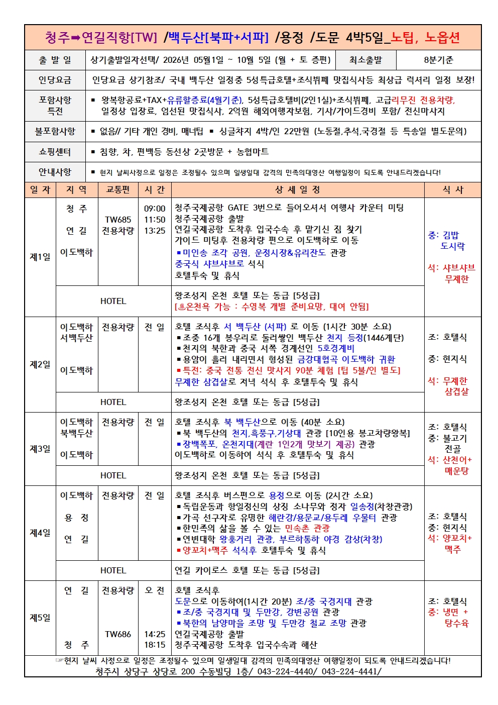 2026년 청주공항 대한국인의 모태성지 백두산여행 국내 최상급 럭셔리 문화탐방 효도여행 초특급 일정 보장 백두산 서파+북파+(남파)여행 전국예약센터 월드라이프여행사 043-224-4440