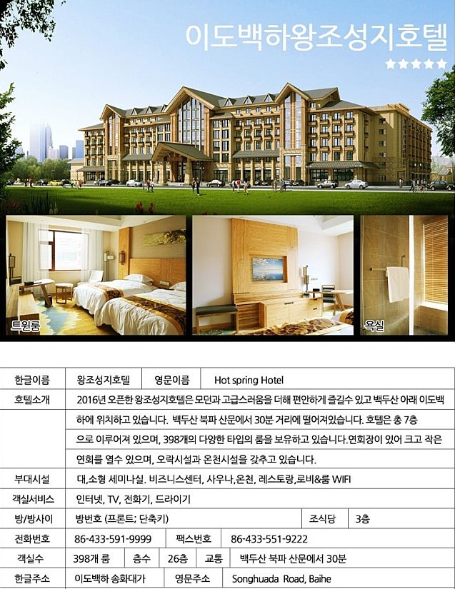 · 특장점: 이 호텔의 핵심 가치는 바로 ‘천연 화산 온천의 도시화’ 입니다. 백두산 일대 지하수의 높은 미네랄 함량을 바탕으로 한 온천 시설은, 힘든 백두산 등산 후 피로를 회복시키는 완벽한 인프라를 제공합니다.
