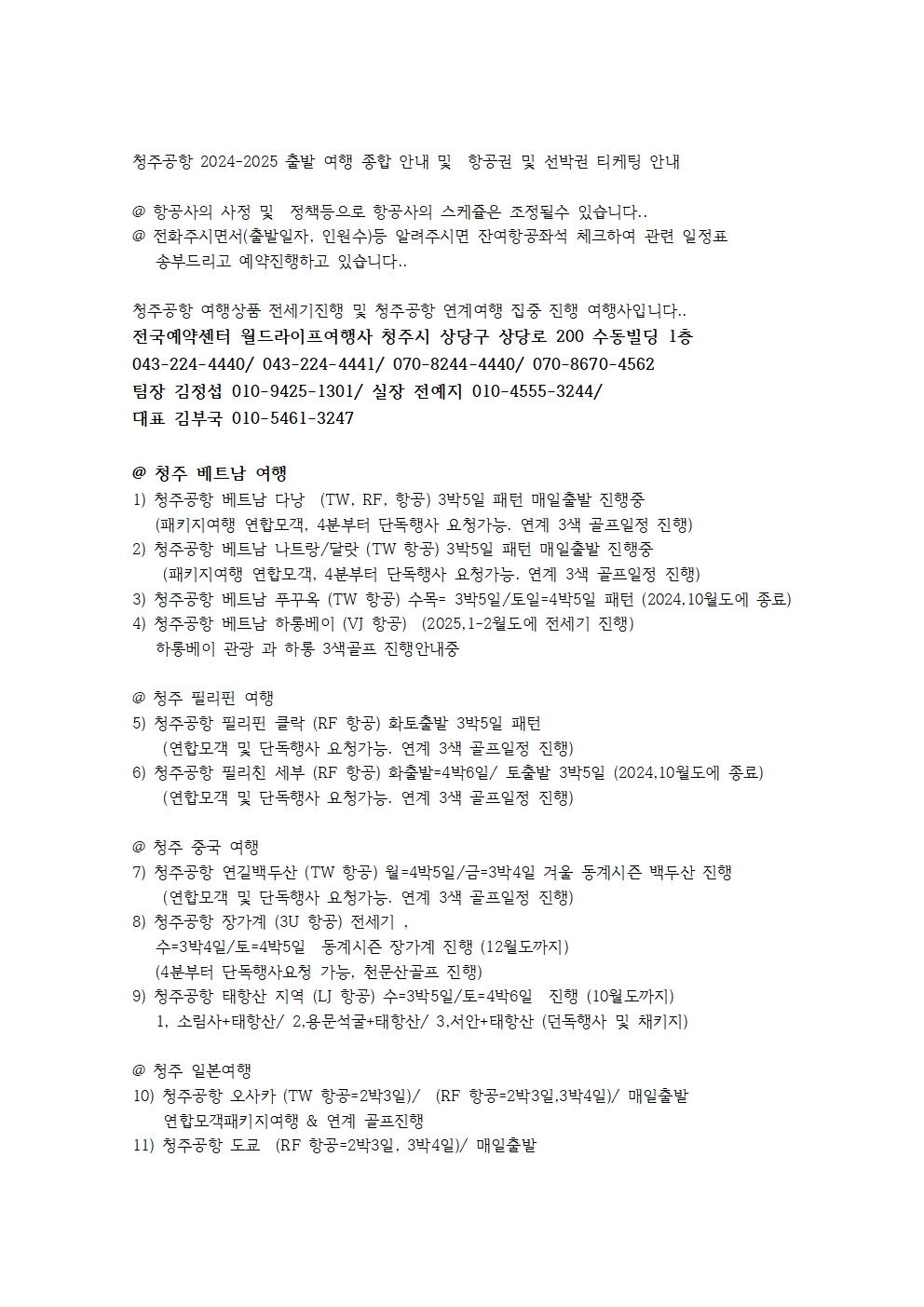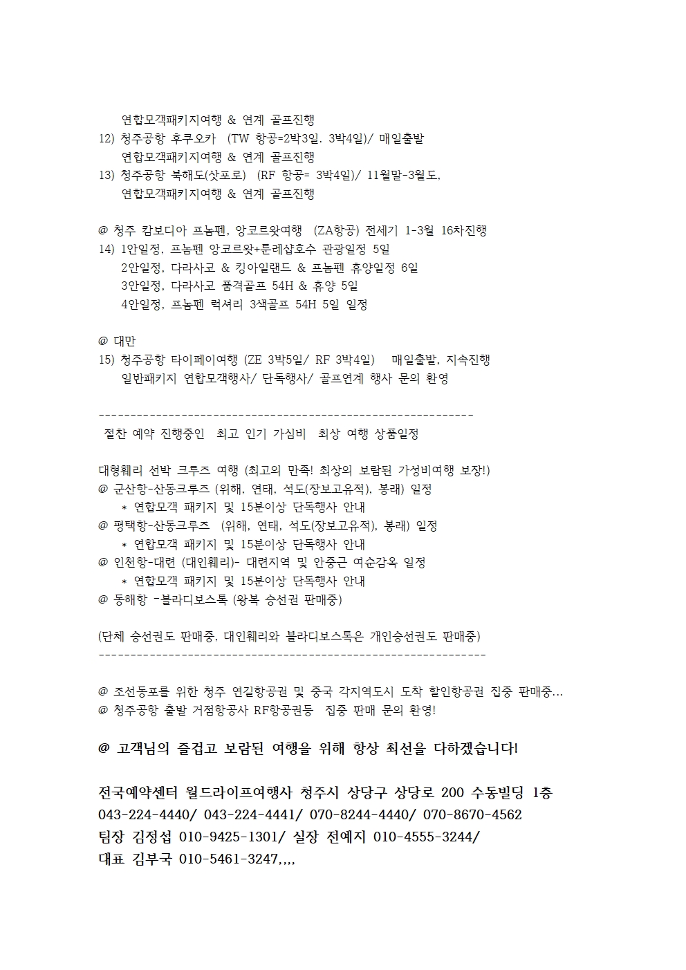 청주공항 여행진행상품 예약안내 및 연길 항공권 및 선박 크루즈 중국여행 전국 예약센터 월드라이프여행사 김부국대표 010-4351-3247